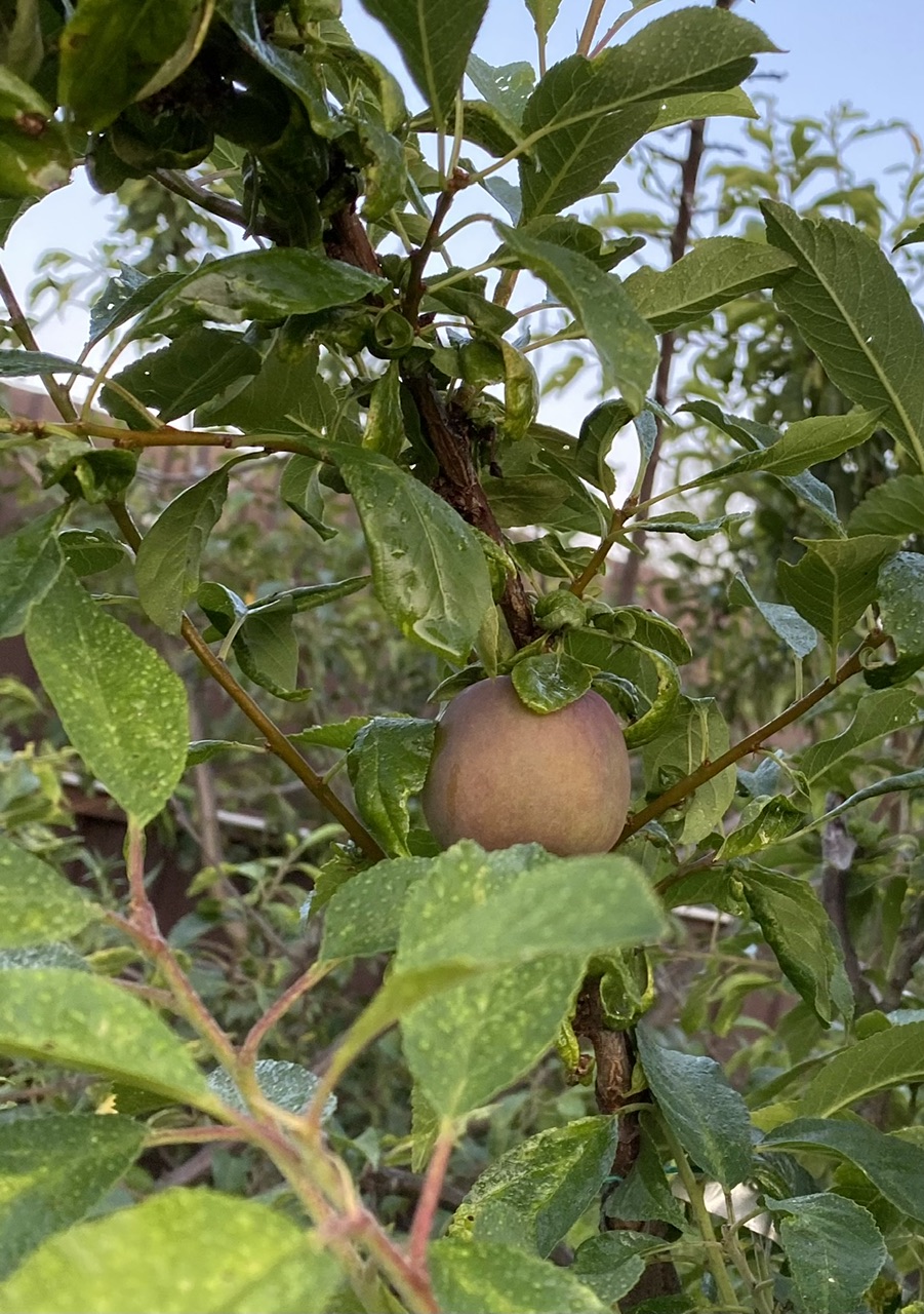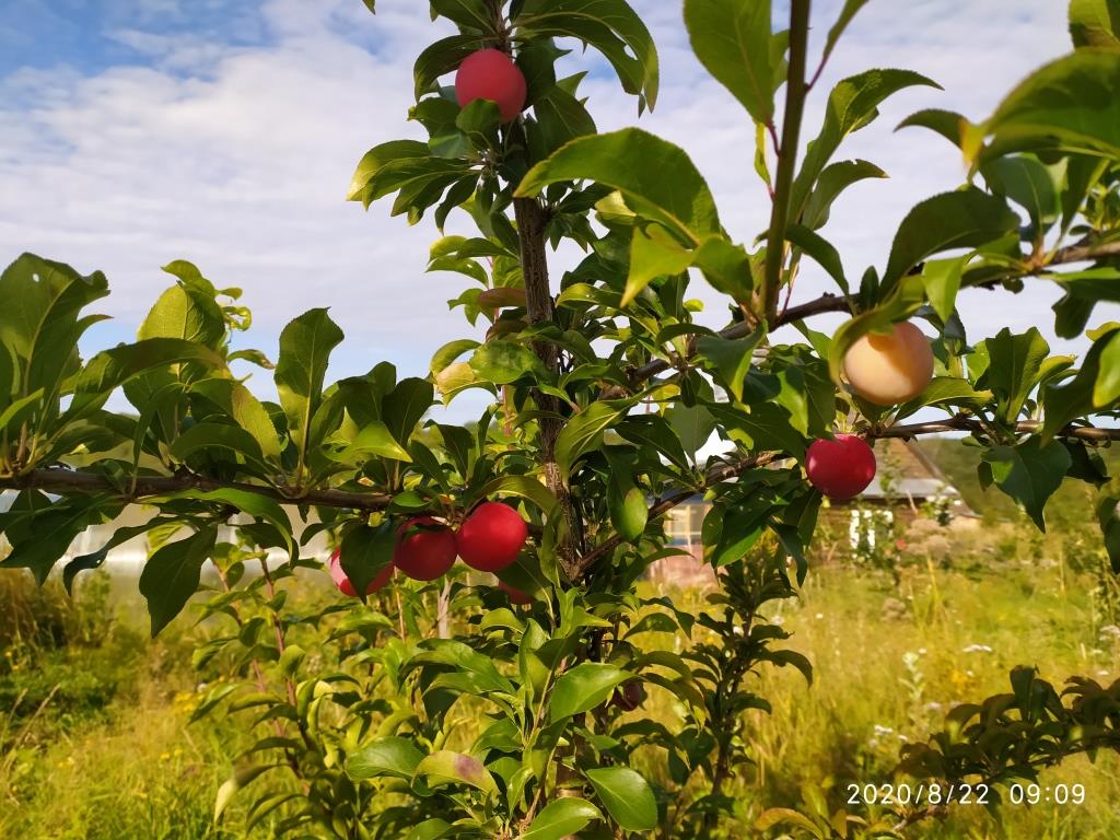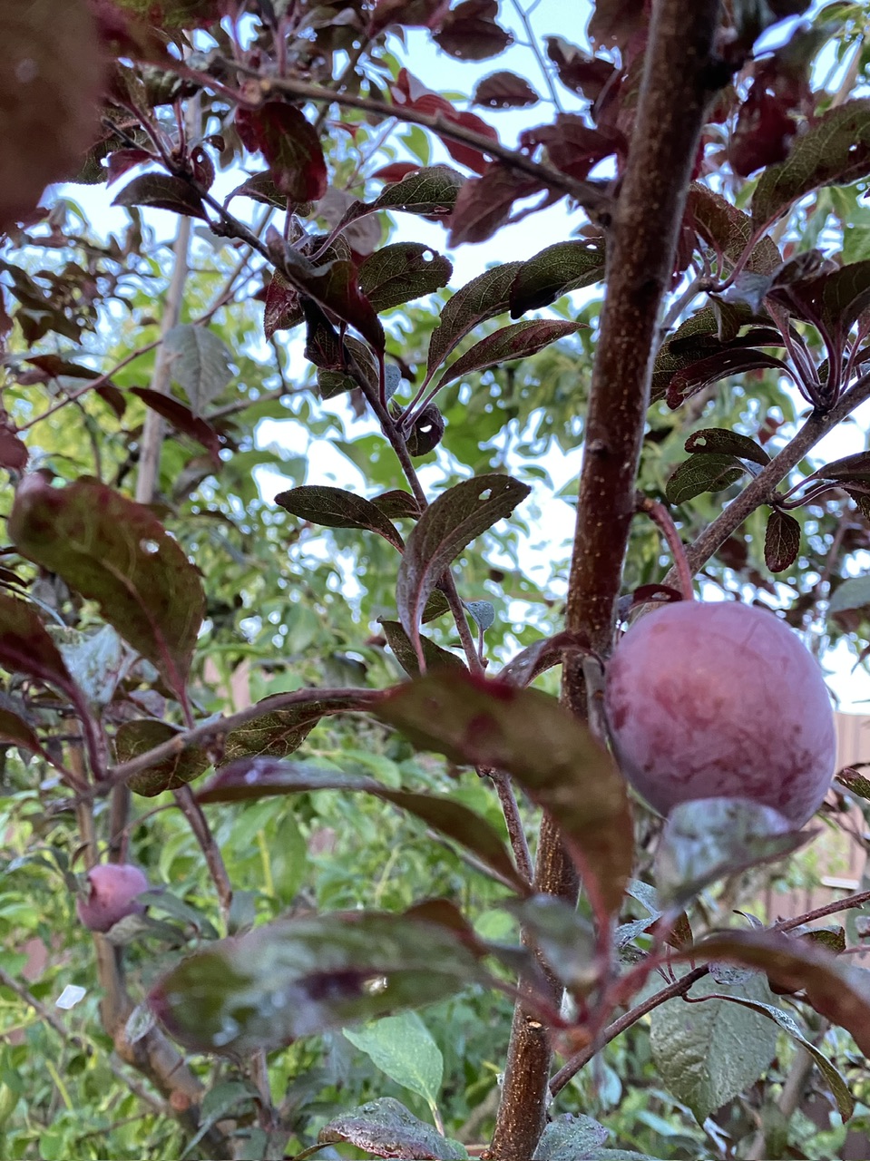 Начала окрашиваться гибридная слива Блэк Айс (р. Americana x p. salicina), на вид 60 грамм. В кроне китайской сливы Алёнушка. Дерево Блэк Айс (на сеянце алычи) ещё не плодило.
