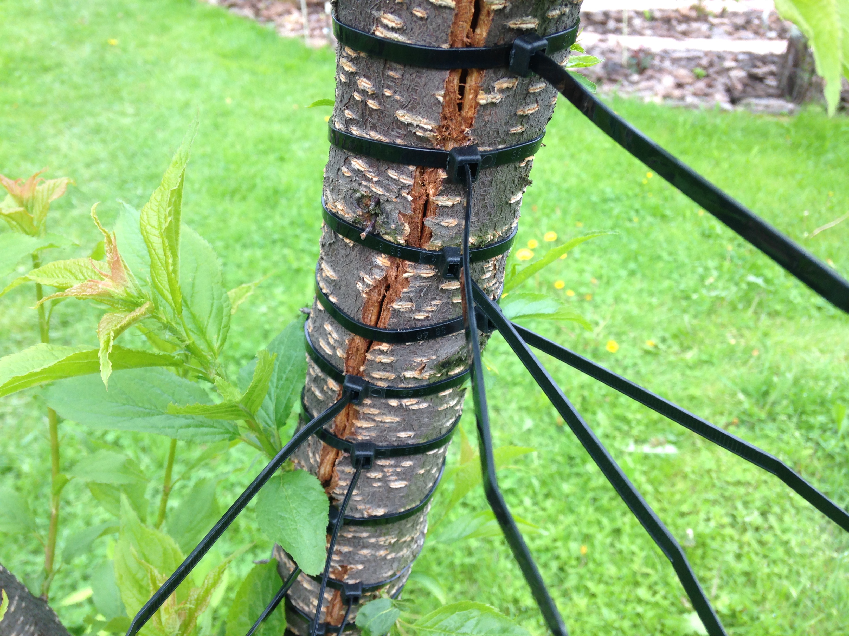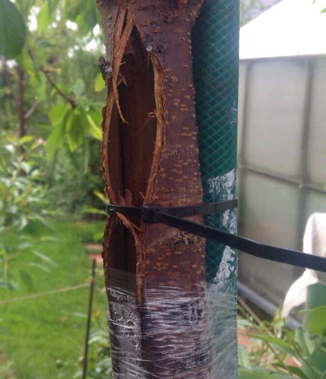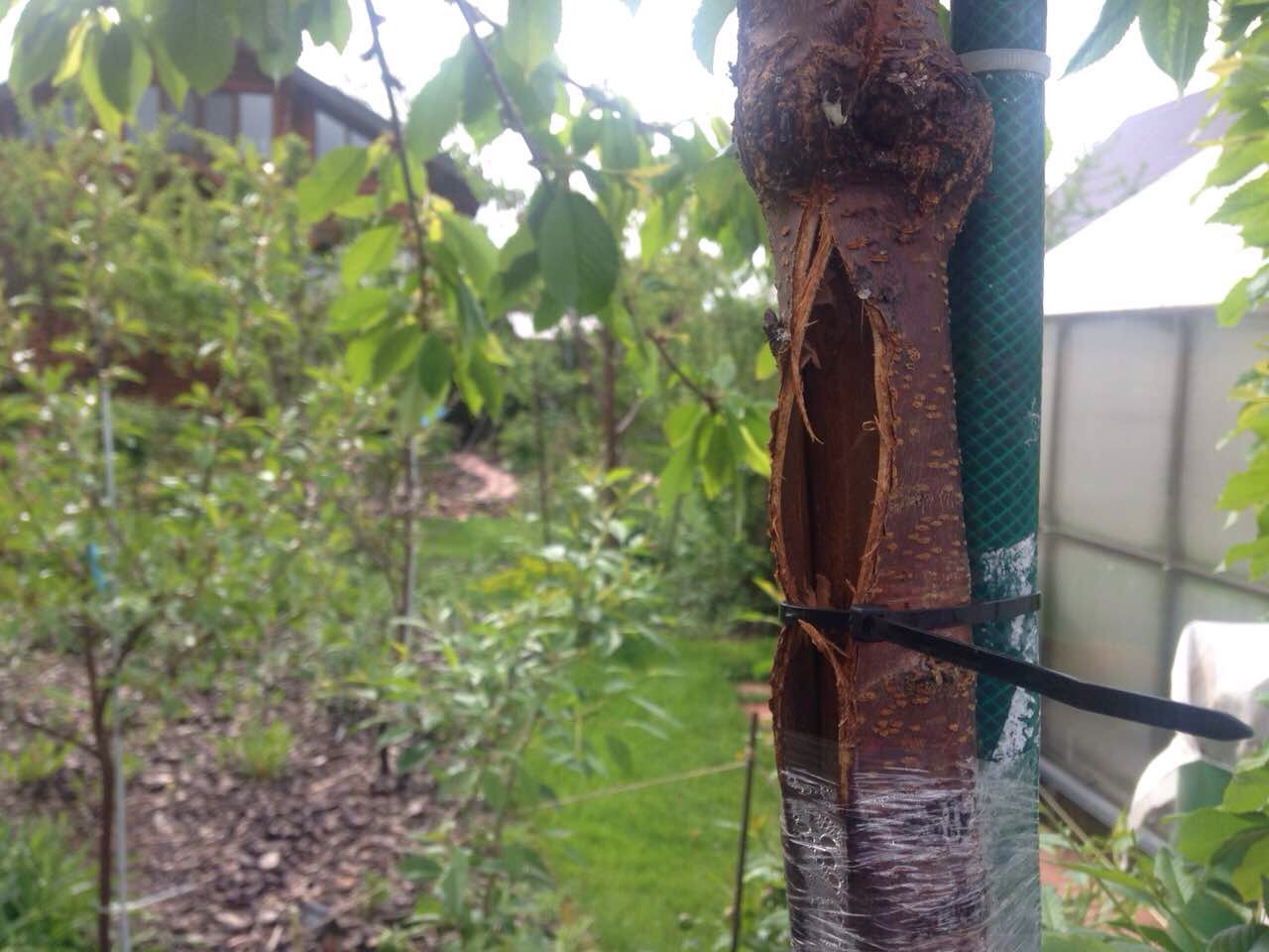 У меня ствол черешни Фатеж рвануло прошлогодней весной, когда я обрезала довольно толстую самую нижнюю смотрящую вниз ветку, бесперспективную и без плодовых почек. Разрыв по стволу развернуло около 25 см длиной. Замазала коровьим навозом и замотала лентой-серпянкой. А потом почитала в сети про обрезку с защитным звеном - веточку на первое время надо было от ветки оставить.
