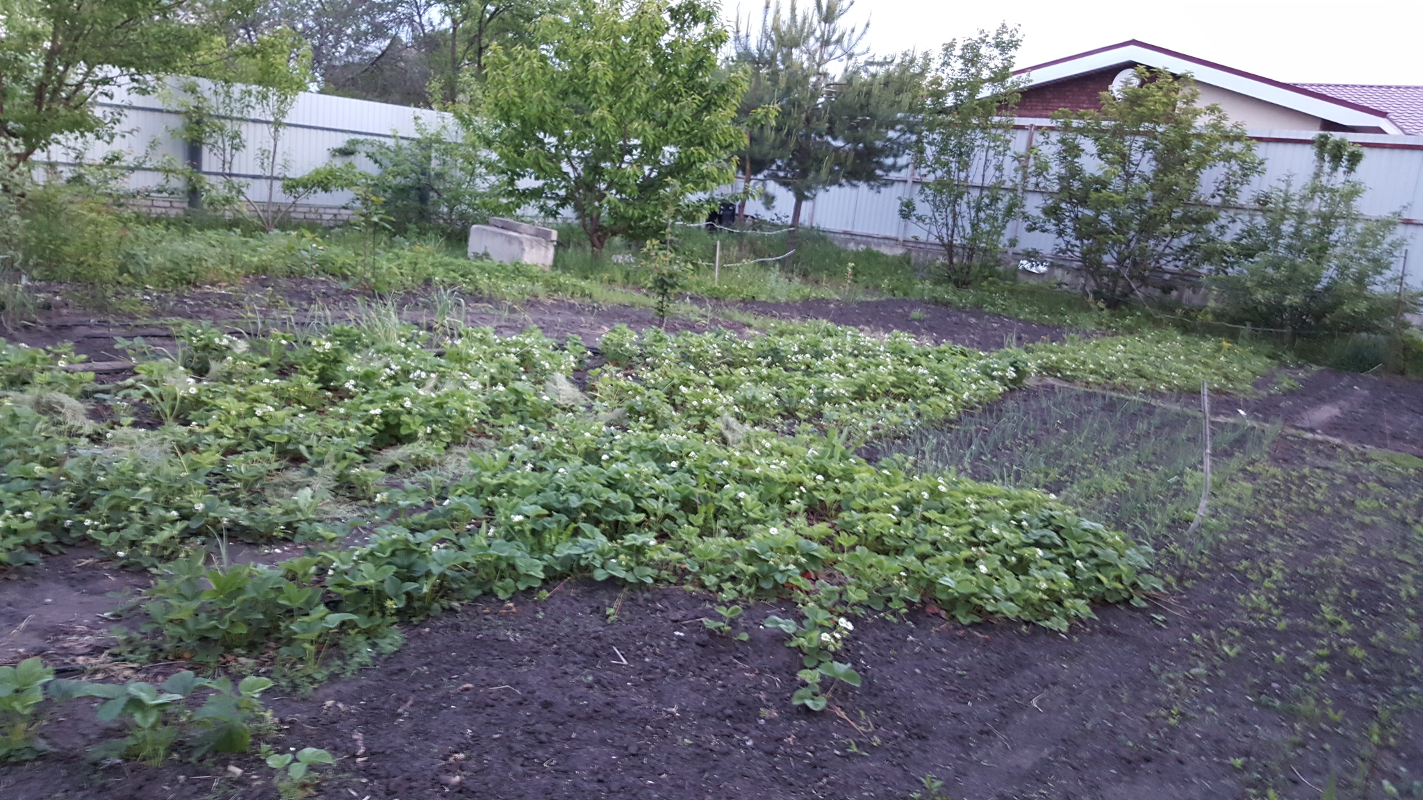 Для иллюстрации. Я в основном всю землянику выращиваю на черном спанбонде, с капельным поливом, подкормками и обработками по расписанию. Да, времени отнимает много. Есть немножко Соловушки, посаженной в междурядьях жимолости. Вот они по заветам Алексея растут - ничего не делал с ними, только полив и то когда жимолость поливал.