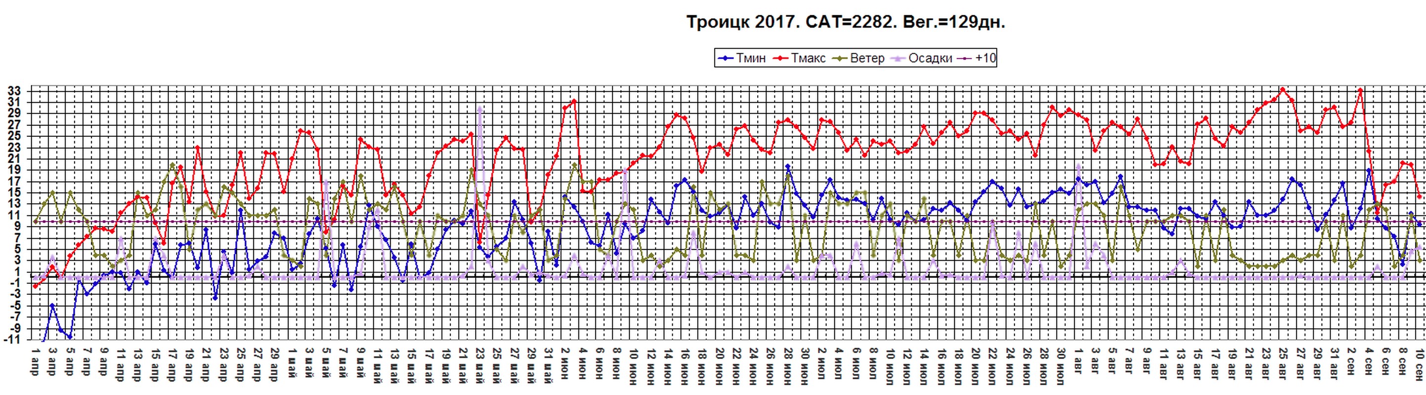 У меня по состоянию на 07.09.17 САТ по данным с rp5 для Рязани САТ составляет 1981,8 градуса. В прошлом сезоне САТ по итогам сезона составил 2637 градусов. По данным атласа Рязанской области от 1965 г. САТ для севера области (район Тумы и Елатьмы) составлял на уровне 2150-2200 градусов. В этом году не набирается и этого. С виноградом совсем беда. Моя Альфа даже еще окрашиваться не начала. В прошлом году хоть сахара и не набрала, но 1 октября я ее всю собрал на вино. А в этом похоже я без вина остался.