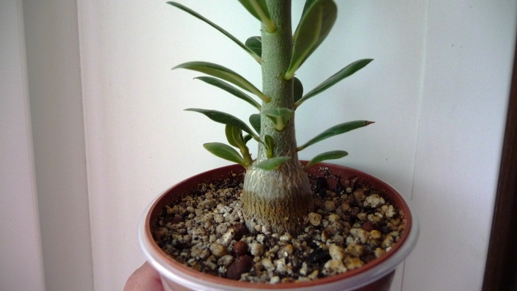 На данный момент у меня 24 растения. Плюс около 20 сеянцев весеннего посева. (отправила их на зимовку к свекрови). Сейчас тоже 3 адениума готовятся к цветению, но не знаю, перенесут ли они нынешнюю осеннюю серость. Стоят на восточном окне без подсветки. На днях приехал новенький, привитый. Трипл, обещано махровое цветение. Вот он на фото.