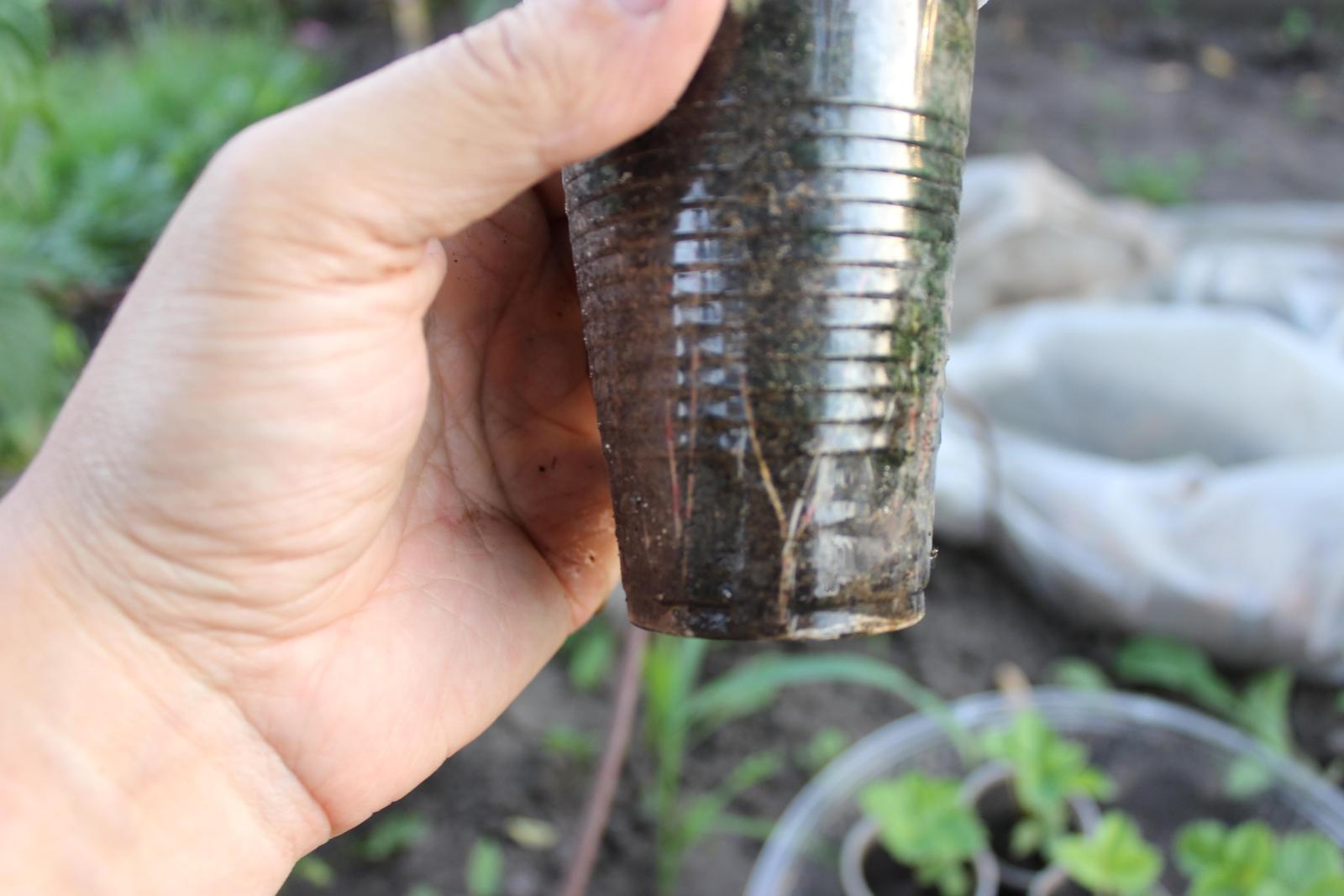 На самых сильных кустах, сформировавшихся из самых мощных (на момент срезки) розеток корни достигли дна стакана, а значит, можно высаживать на ПМЖ.