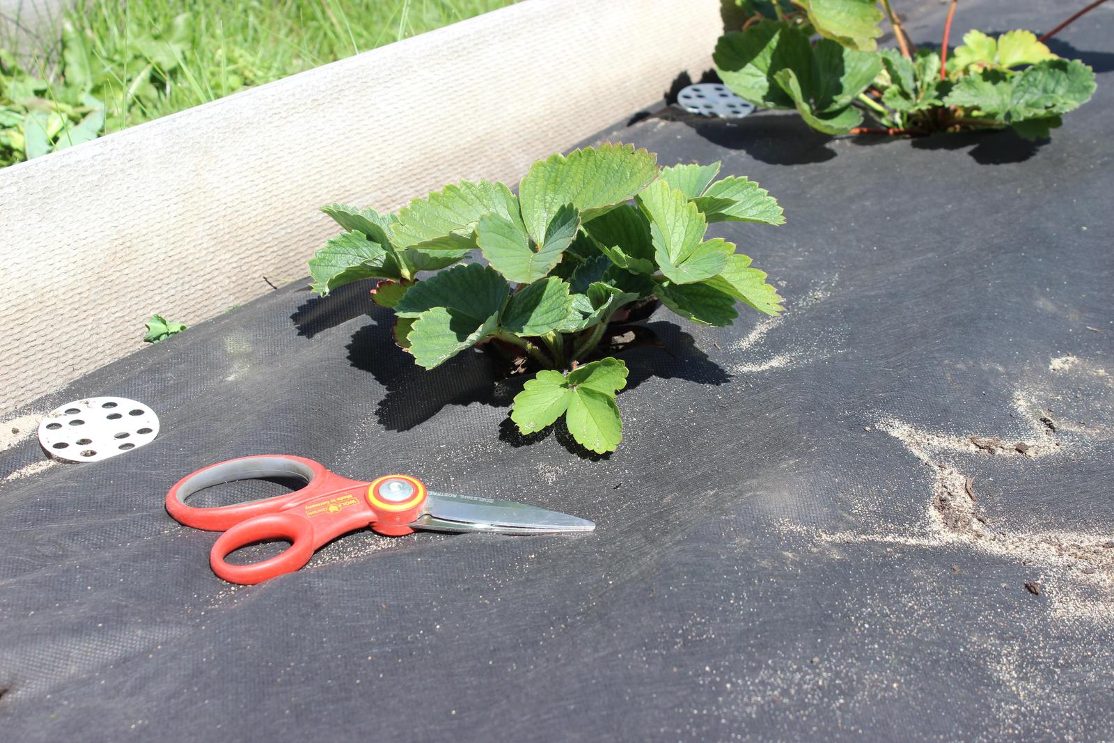 Вот моя посадка прошедших выходных. Первый раз сажала на спанбонд. Лучше всего получилась рассада, которую укореняла в 6 см стаканчике " при маме", а столон обрезала непосредственно перед посадкой. В больших стаканах сажать в разрез в спанбонде очень неудобно было, корни обрывались.