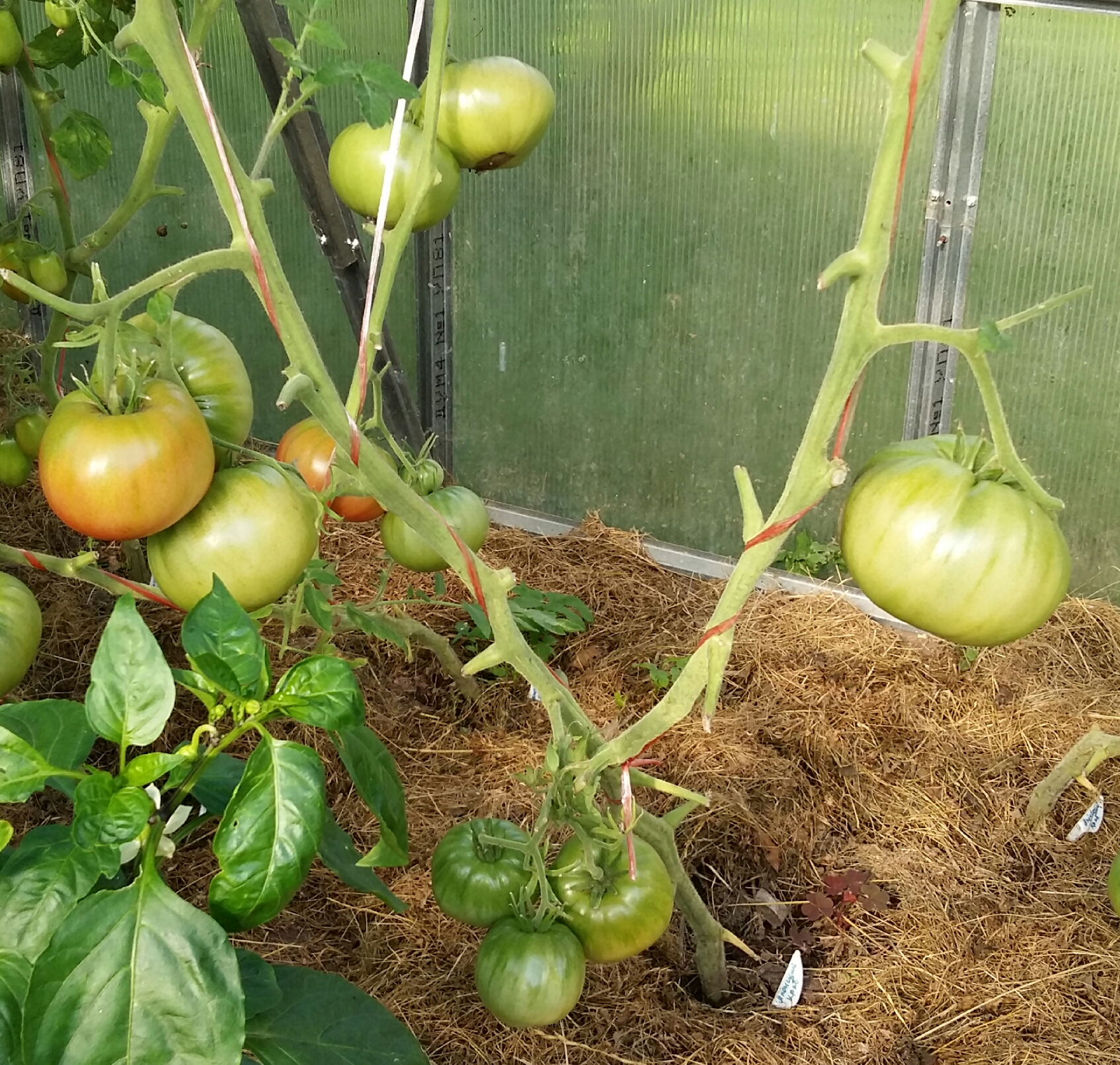 На фото осенний урожай, который растет почти у "потолка" теплицы, высотой 2,5 м (на переднем плане сердцевидные плоды)