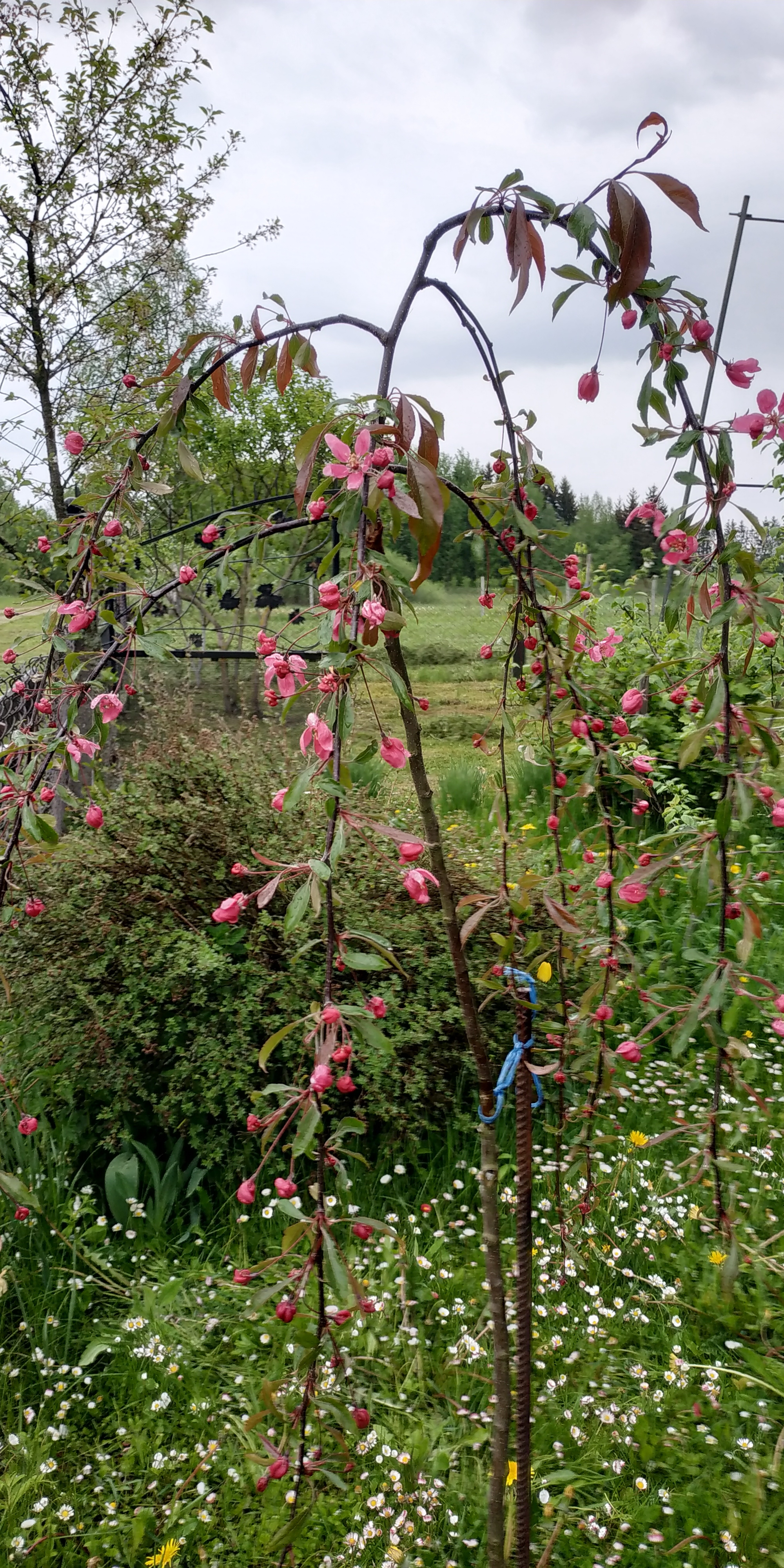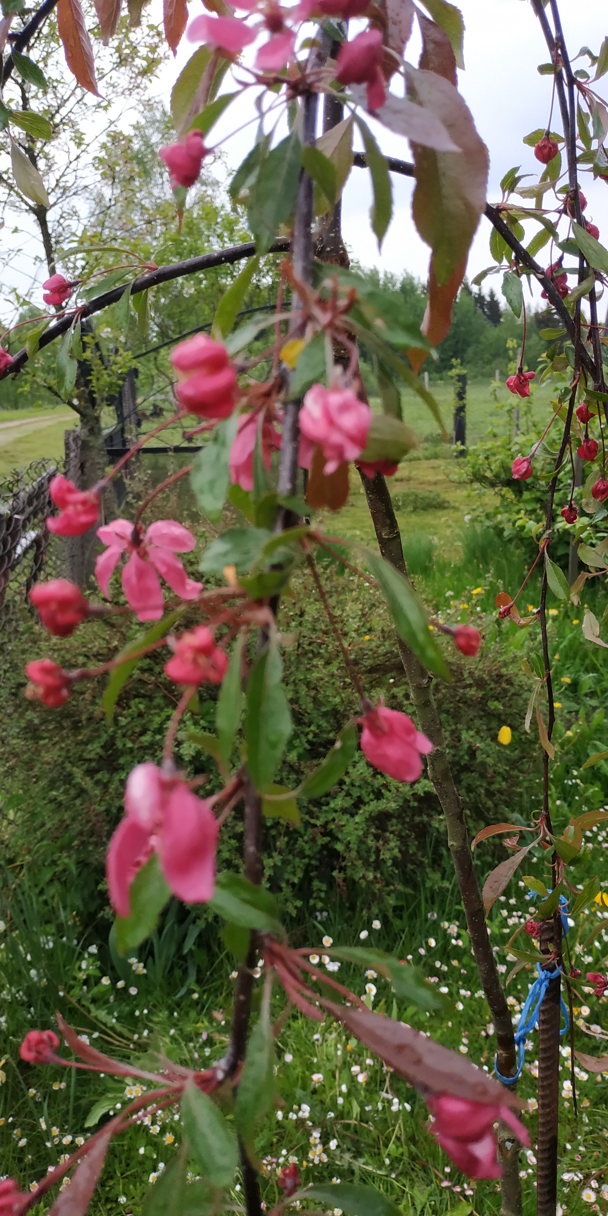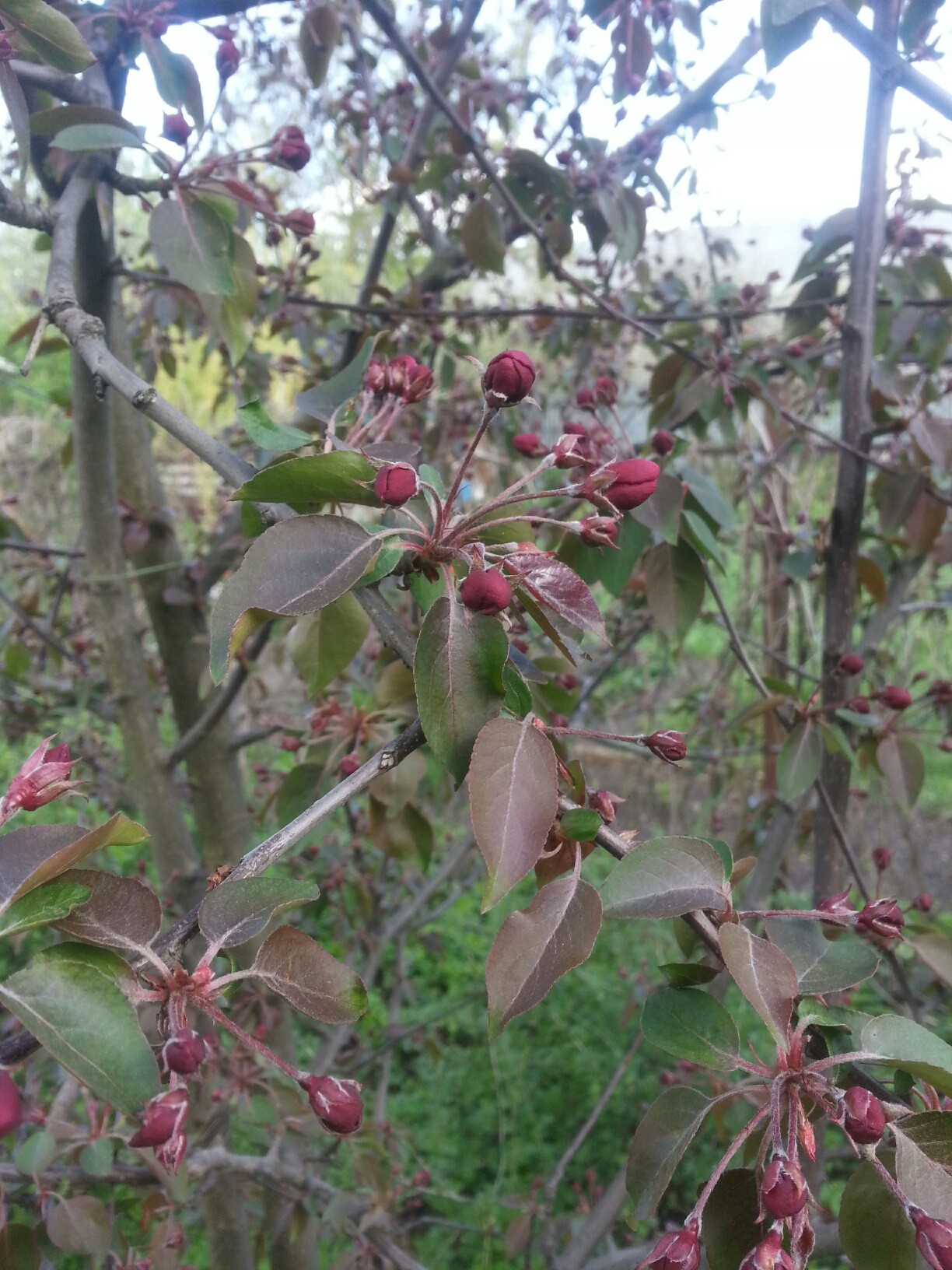 Borisko, похоже на яблоню пурпурную. Листья окрашены в пурпурный цвет, но у некоторых разновидностей со временем приобретают зеленую окраску.