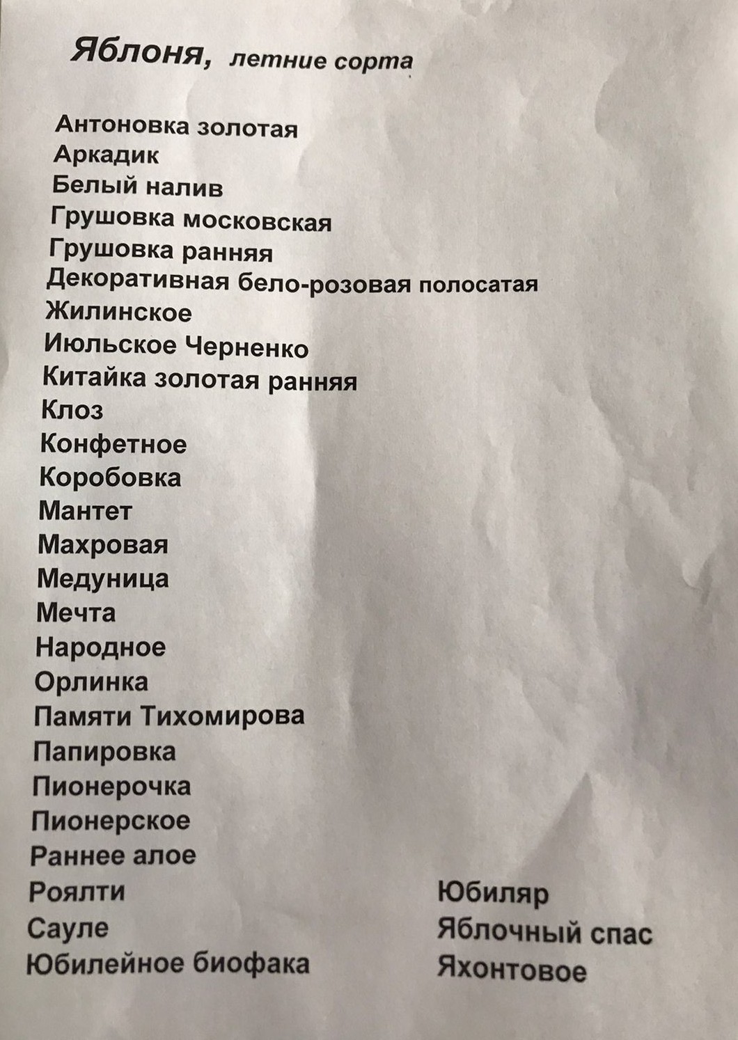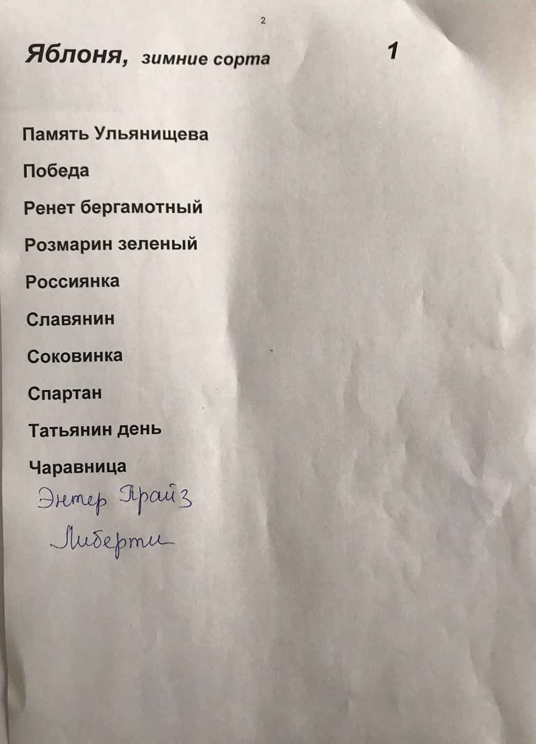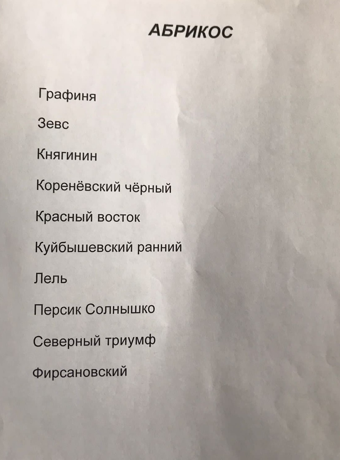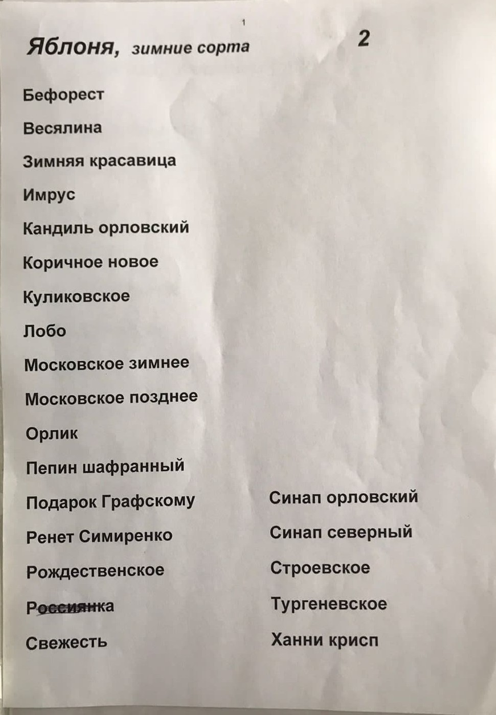 ЗИМНИЕ по 120р: Афродита, Богатырь, Болотовское, Брянское, Весялина, Восход, Вымпел, Зорка, Кандиль Орловский, Марс (ВНИИСПК), Маяк Загорья, Мунстер, Орфей, Памяти Нестерова, Память Липунову, Память Сикоры, Память Сюбаровой, Память Ульянищева, Патриот, Персиковое, Розоватое Зимнее, Синап Орловский, Спартан, Строевское, Флагман, Юбилей Москвы, Янтарь;