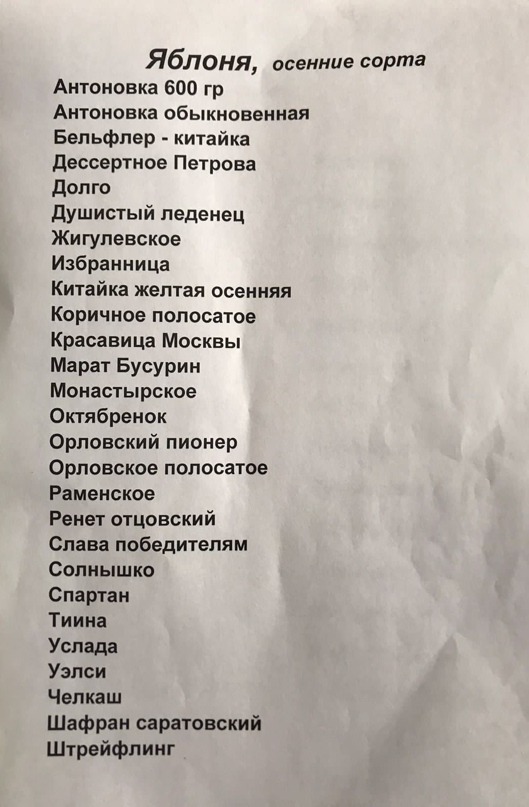 ОСЕННИЕ по 120р: Академик Казаков, Антоновка обыкн., Белое Имунное (Десертное Кичины), Белорусское Сладкое, Бельфлёр-китайка, Брусничное, Жигулёвское, Коричное Ананасное, Коричное Полосатое, Крапач, Лобо, Марат Бусурин, Матрёшка, Монастырское Осеннее, Орлик, Паланез, Пурпурное, Родникова, Рождественское, Слава Победителям, Снежок (Дочь Антоновки), Услада, Челкаш, Штрейфлинг;