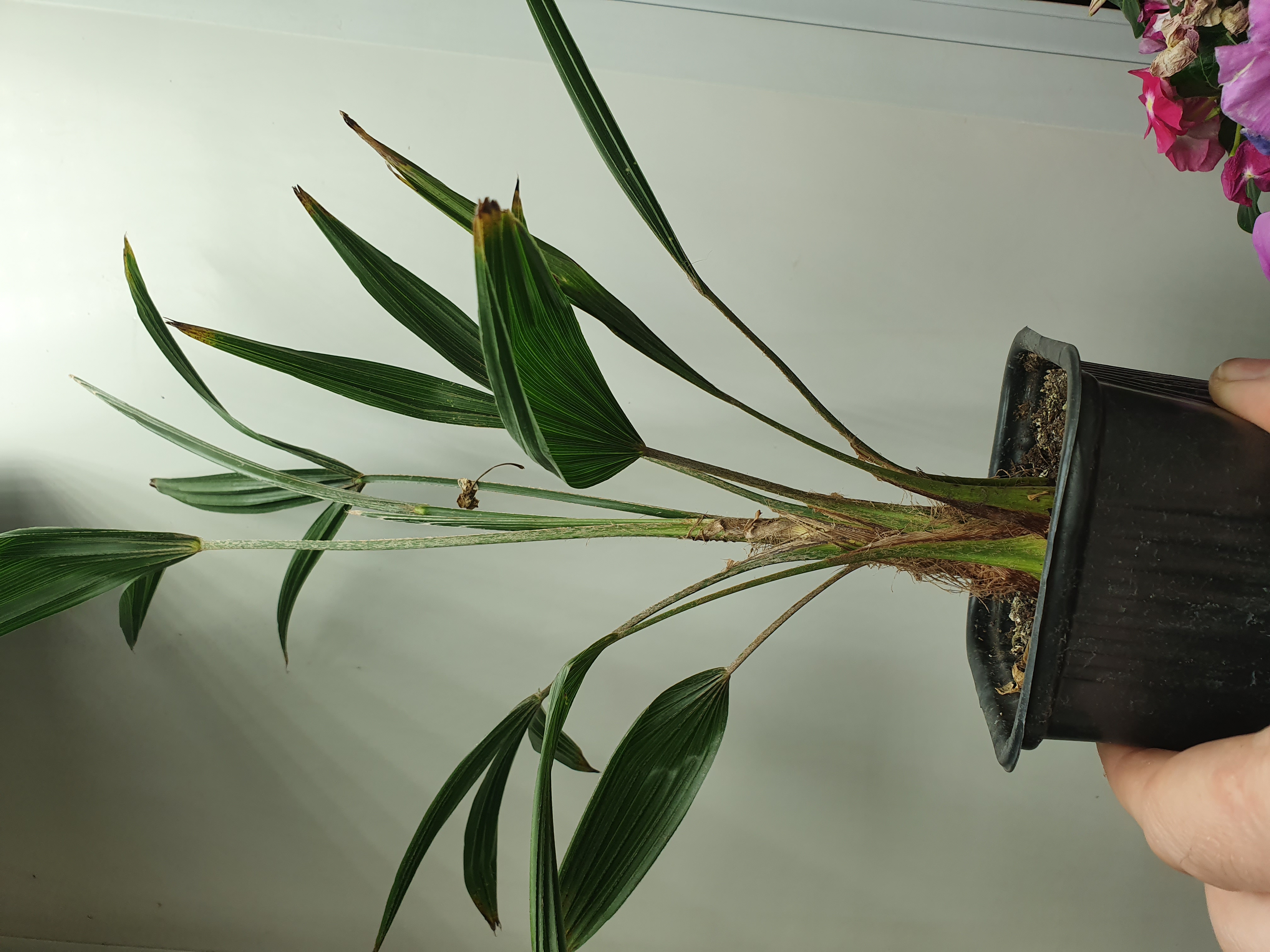 Его только на днях посадили, лишние корни , чтобы вошел в горшок, отрубили, обычная практика.На площадке также есть предупреждения , переносить только за емкость.