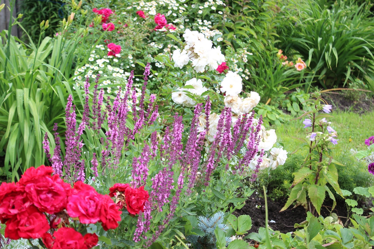 Таня, идея проста и не нова. У тебя там два больших ПОСТОЯННЫХ цветовых пятна - красноеи белое. Две розы. Если танцевать от фотографии букета, который тебе нравится (мне тоже), то добавляем нежно-розовый. Постоянное цветовое пятно может дать из цветущих кустарников только роза. Остально все будет только на какой-то времнной период.Я знаю, что ты розы больше не покупаешь, НО есть одна розочка The Fairy , совершенно беспроблемная, я ее даже не всегда укрываю. Растет у меня уже лет тридцать. Цветочки мелкие 3-4 см, махровые. Создаст именно то нежно-розовое пятно, которое надо. И плюс я бы рассмотрела молочноцветковые колокольчики - сортов море , разные и по цвету, и по высоте. Цветут очень долго. А все остальное уже добавлять по необходимости.