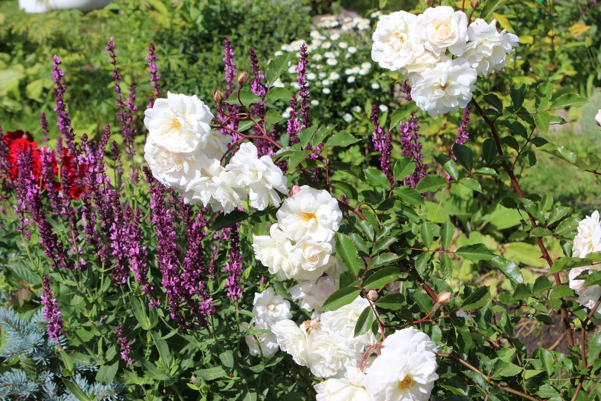 Еще прошу учитывать, т.к. это тема про розы, то мы выкладываем коллажи отдельных частей цветника. А так Лена совершенно права, про королеву. В этих группах роз тоже есть главные, а есть второстепенные. На заднем плане этой группы у меня сидят две гортензии метельчатые. Так что молочного цвета достаточно. Есть и горные сосенки.