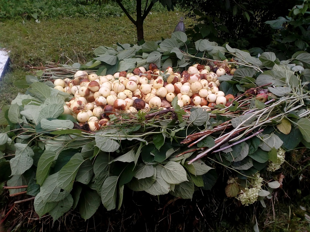 Видны новые ветки гортензии и плоды Белого налива... Иногда втыкаю вертикальные колья...