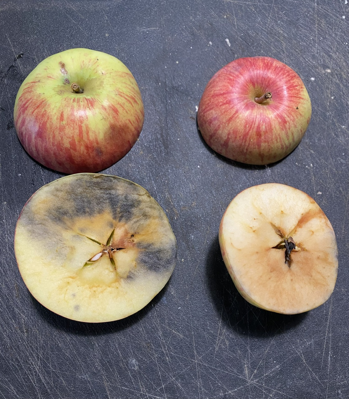 Например, на сегодняшнем фото - йодный тест (намазана йодом половина среза, чтоб был виден цвет мякоти без йода), Мельба (слева) ещё не созрела, Аркадик (справа) созрел.