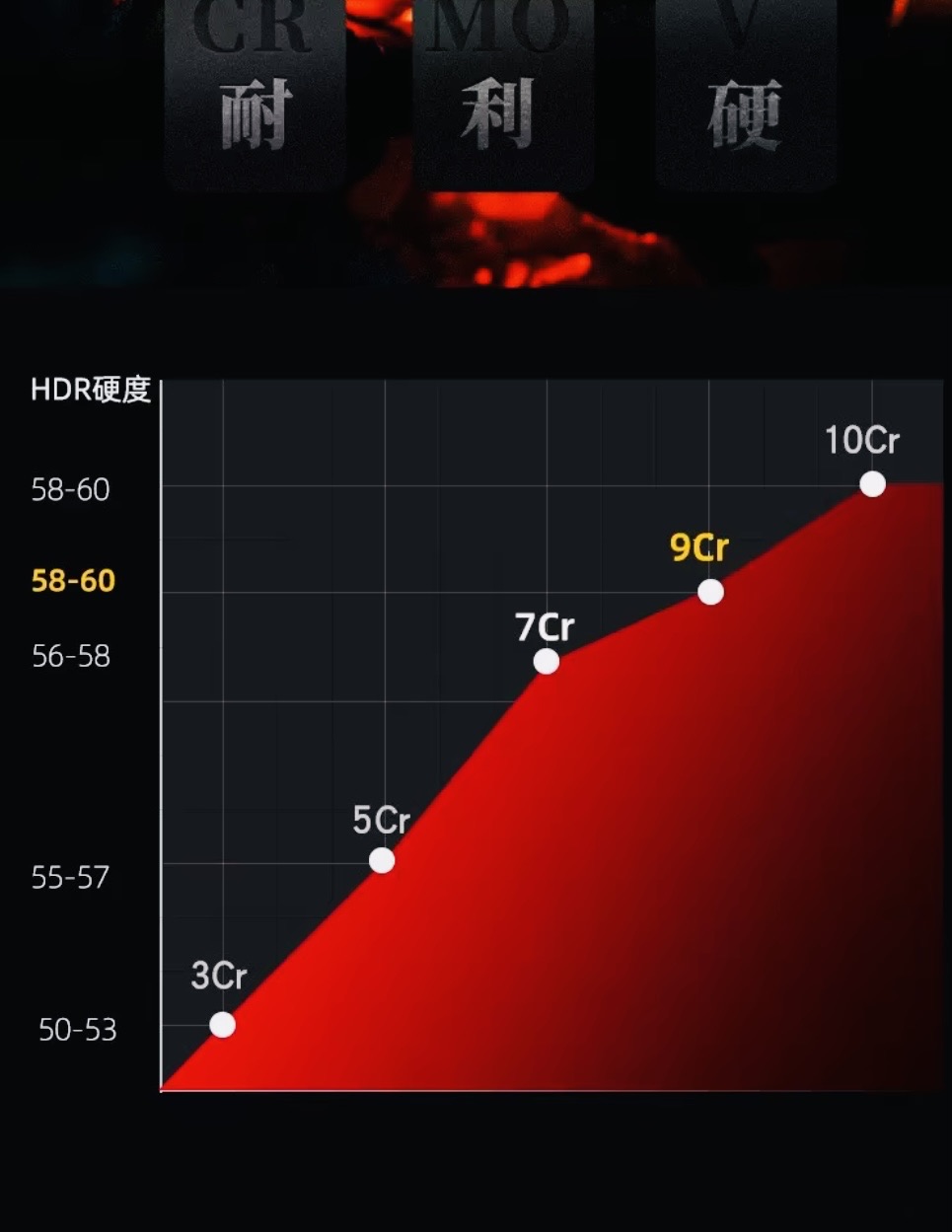 9cr18, углерод 0,9%, хром-18%, твёрдость 59-60 HRC,