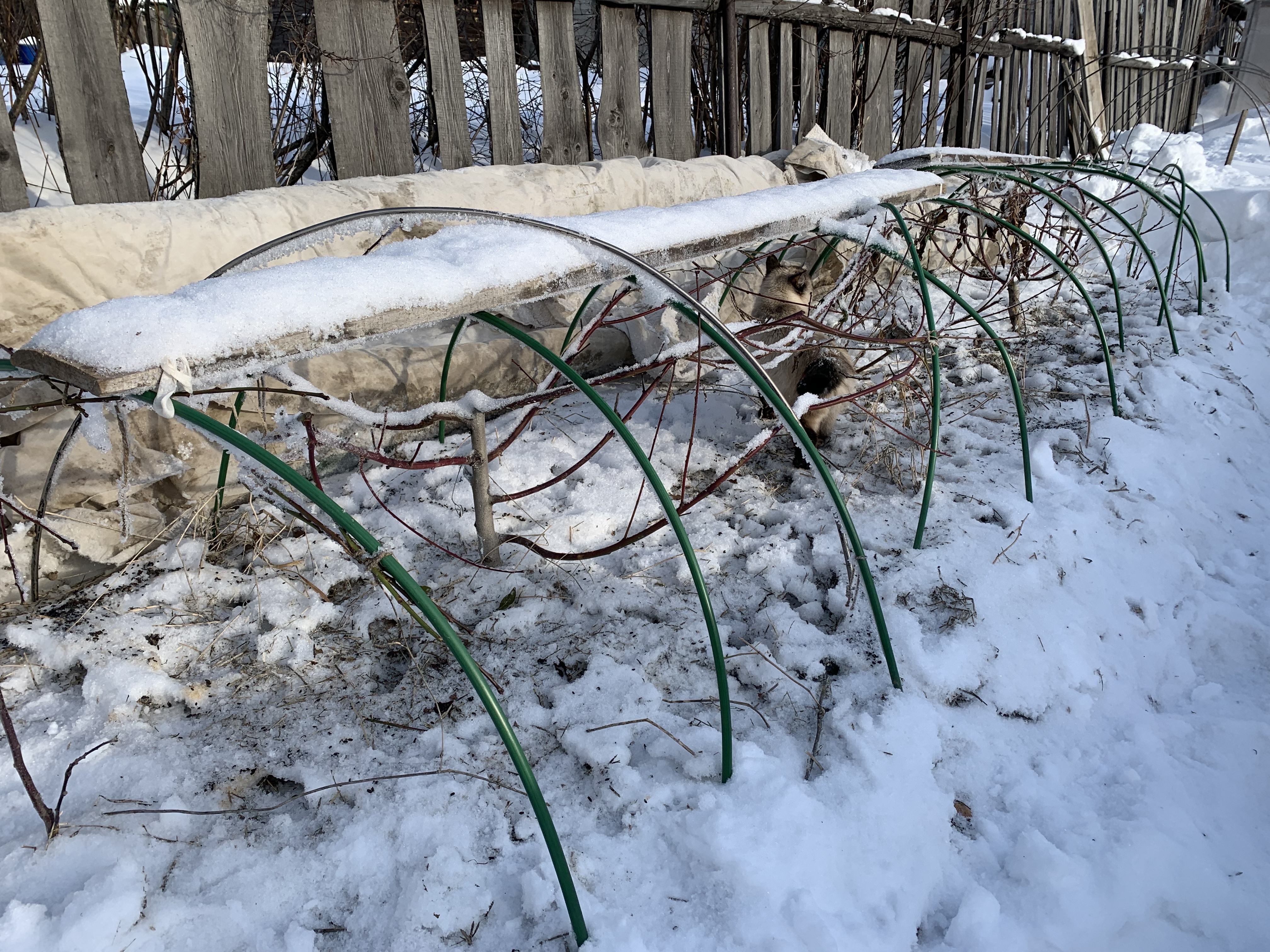 Укрывать стараемся по мерзлой земле. Т.е все готовим, когда еще не очень холодно, ставим каркасы, а укрываем уже по морозцу. Ну и по возможности обтаптываем снег вокруг укрытий.