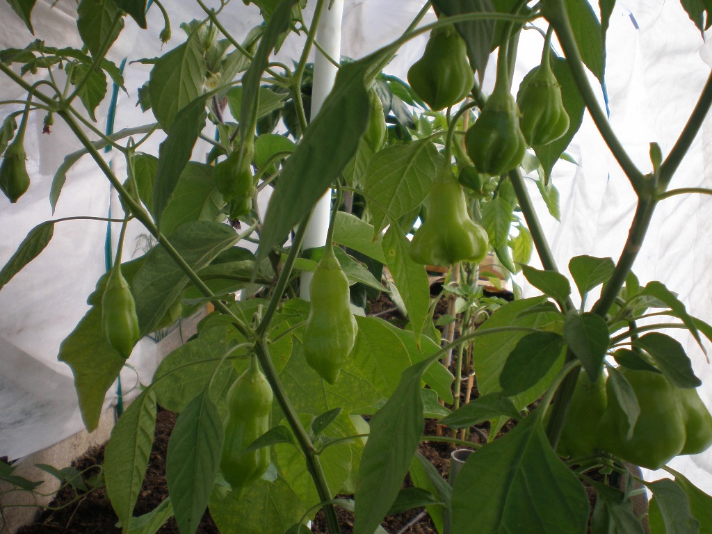 А это мое Двоиное изобилие(горький) и Колокольчик от Кузинамамы. На колокольчике-два основных побега,и на них разной формы перчинки завязываются. Обещала показать...-показываю