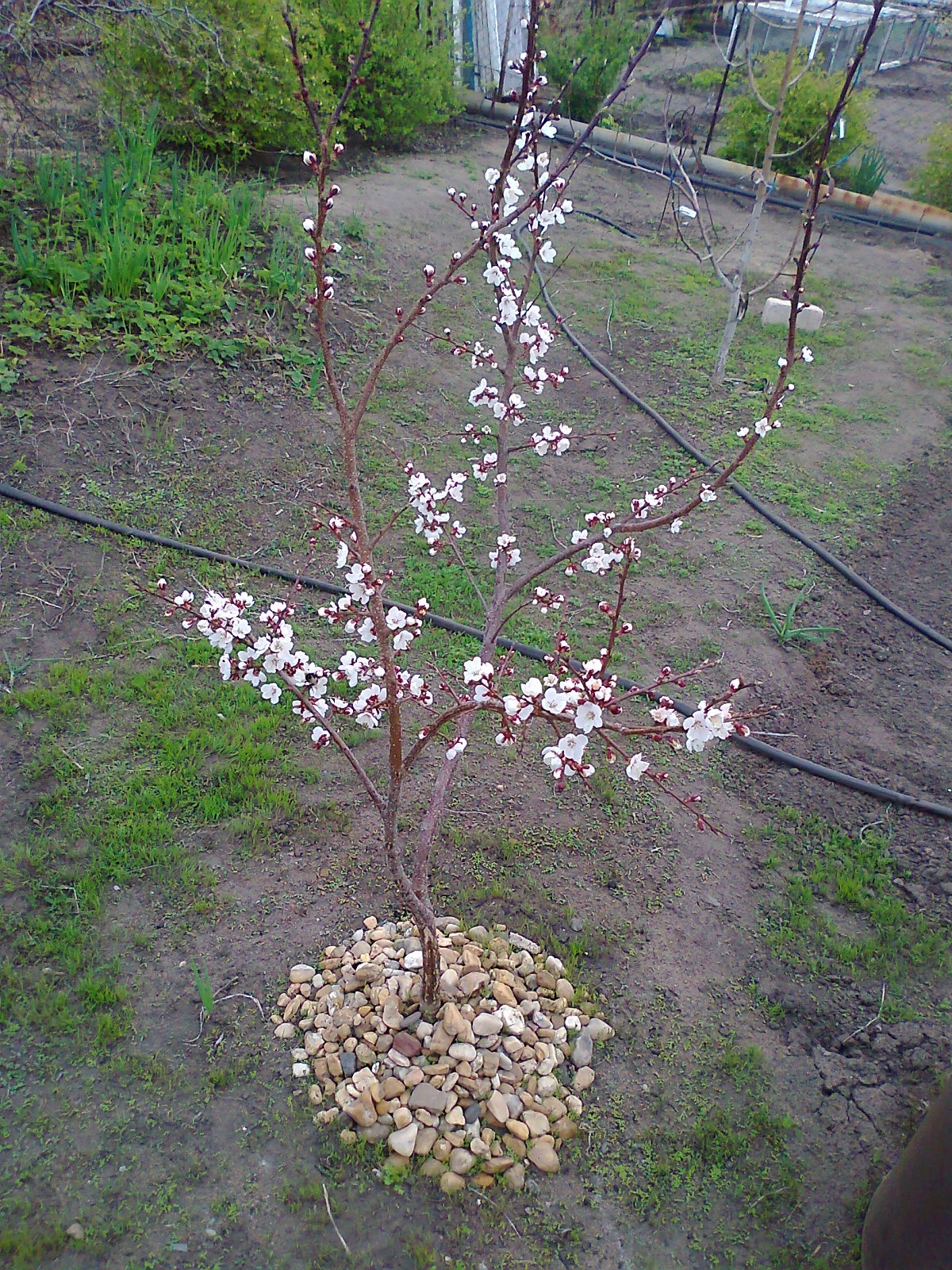 Первое цветение было на Саратовском рубине, привитом на подвое терносливы в прошлом году (прививка 2014г). Все цветы отвалились. В этом году цветение было позднее всех соседских абрикосов (весна затяжная), штук 30 поспело. Цвёл также саженец СР, поспело штук 20.