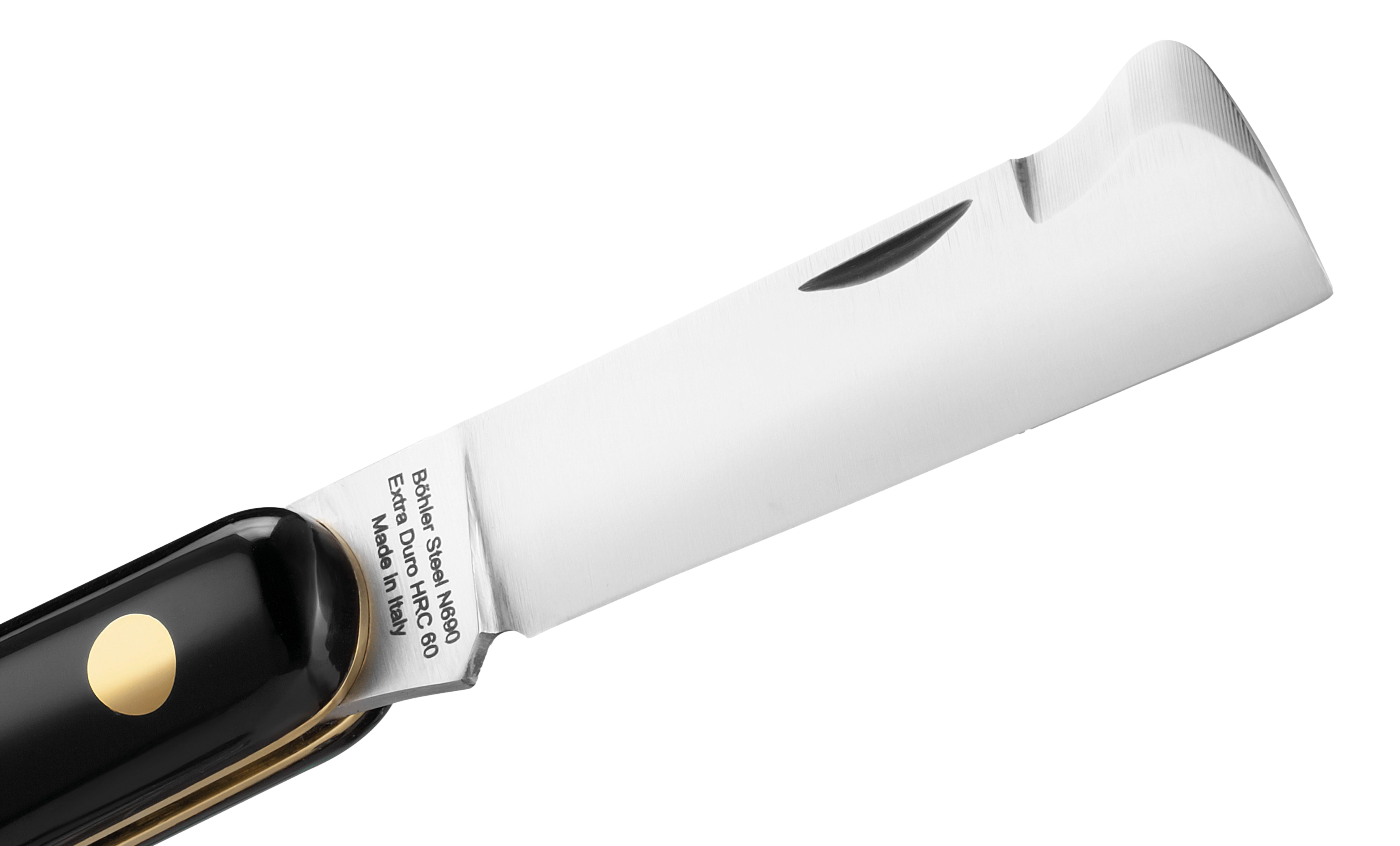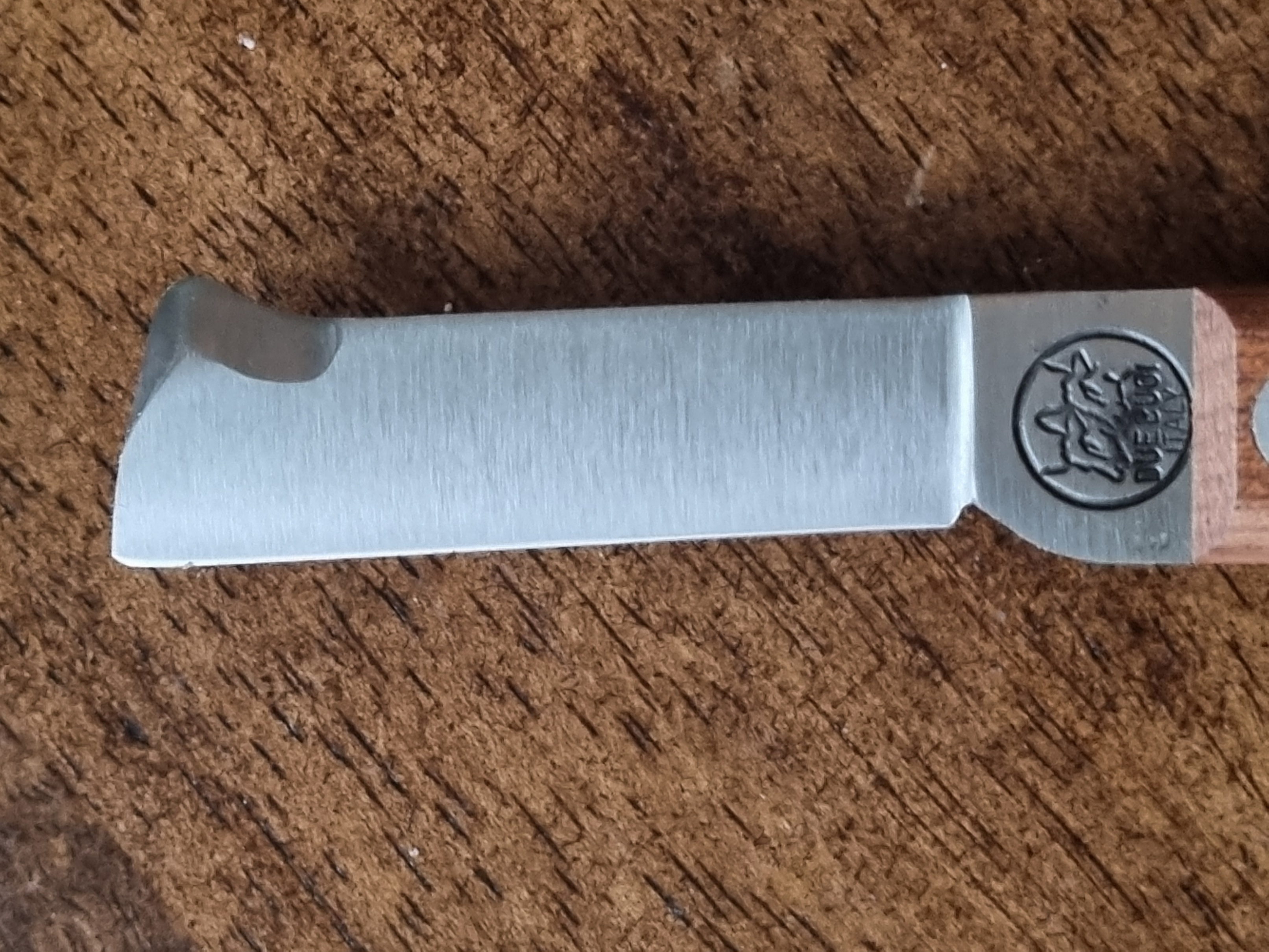 Due Buoi использует, в основном, сталь С100, с твердостью 59-60 HRC и хромом 12%, пара моделей из нержавейки N690.