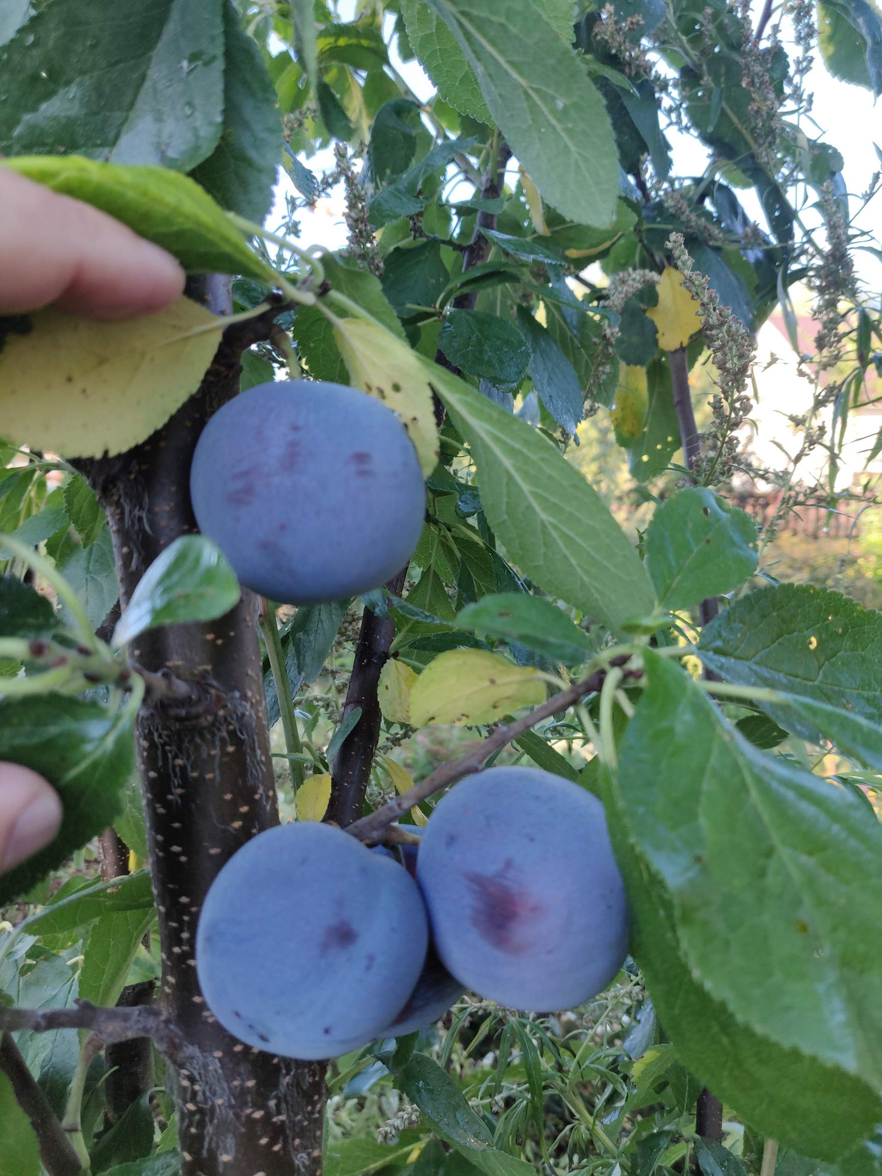 Слива домашняя Этюд (синяя), второе плодоношение, на 7 год урожай большой, но не обломный- много осыпалось завязей и зелёных плодов. Зато оставшиеся крупные и вкусные, косточка отделяется. Только начала поспевать, по срокам позже чем Утро на неделю минимум. Дерево очень высокое.