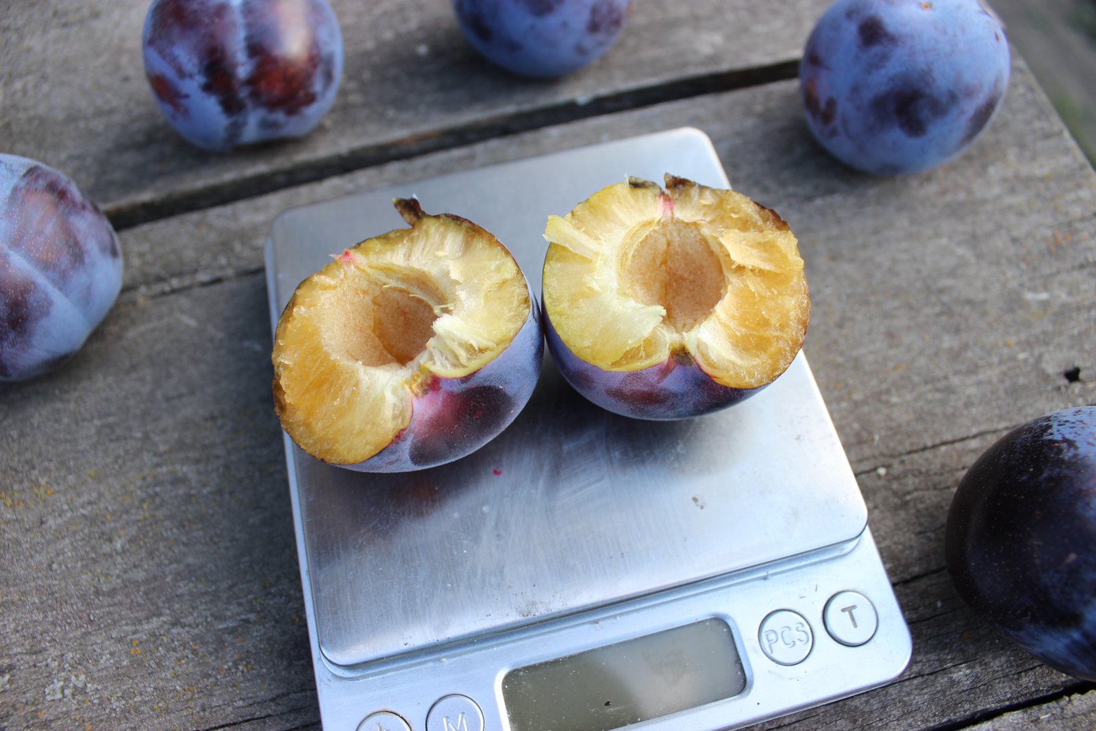 Слива Сувенирная, созрела еще не полностью, но в этом году все с опозданием и вес достойный-72 грамма.