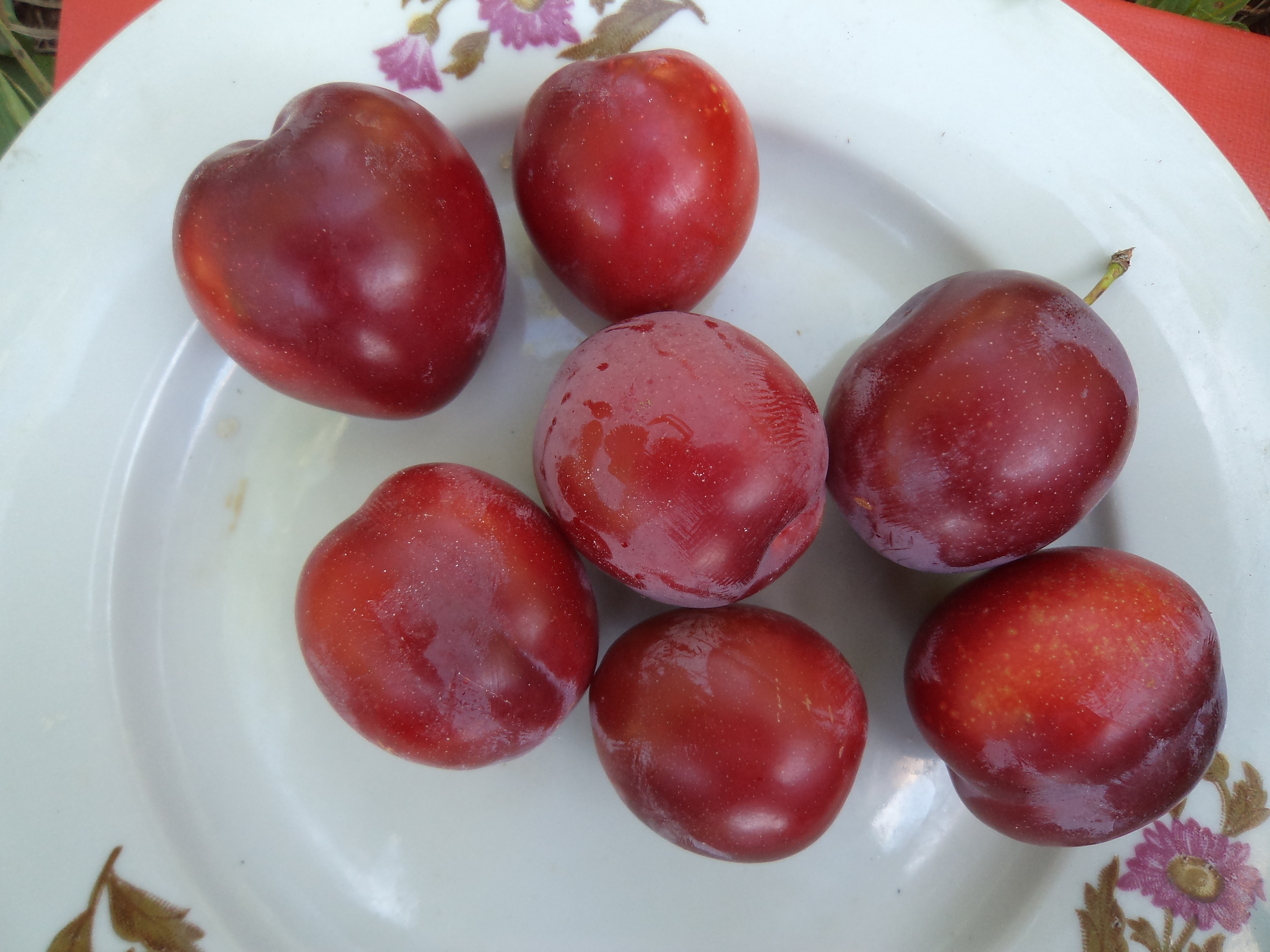 4. Алыча Сеянец Кахенты - стала поспевать к 30 августа, неравномерно, не осыпается. Потребление растянулась на 2 недели. Очень крупная 40-50 гр. Плоды красно- пурпурного цвета. Мякоть хрящеватая, мясистая с красными прожилками. В момент полной спелости хрящеватость уходит. Вкус не типично алычовый, не знаю, как его описать. Косточка маленькая от мякоти отделяется не полностью. Так же в этом году, немного задел ее манилиоз (прививка рядом с прививкой абрикоса, который в этом году полностью сожрал манилиоз), хотя ни разу не видела, чтобы алыча или слива поражались монилиозом. А еще больше чем остальная алыча поражается плодовой гнилью (при этом не отваливается и приходится ходить собирать).