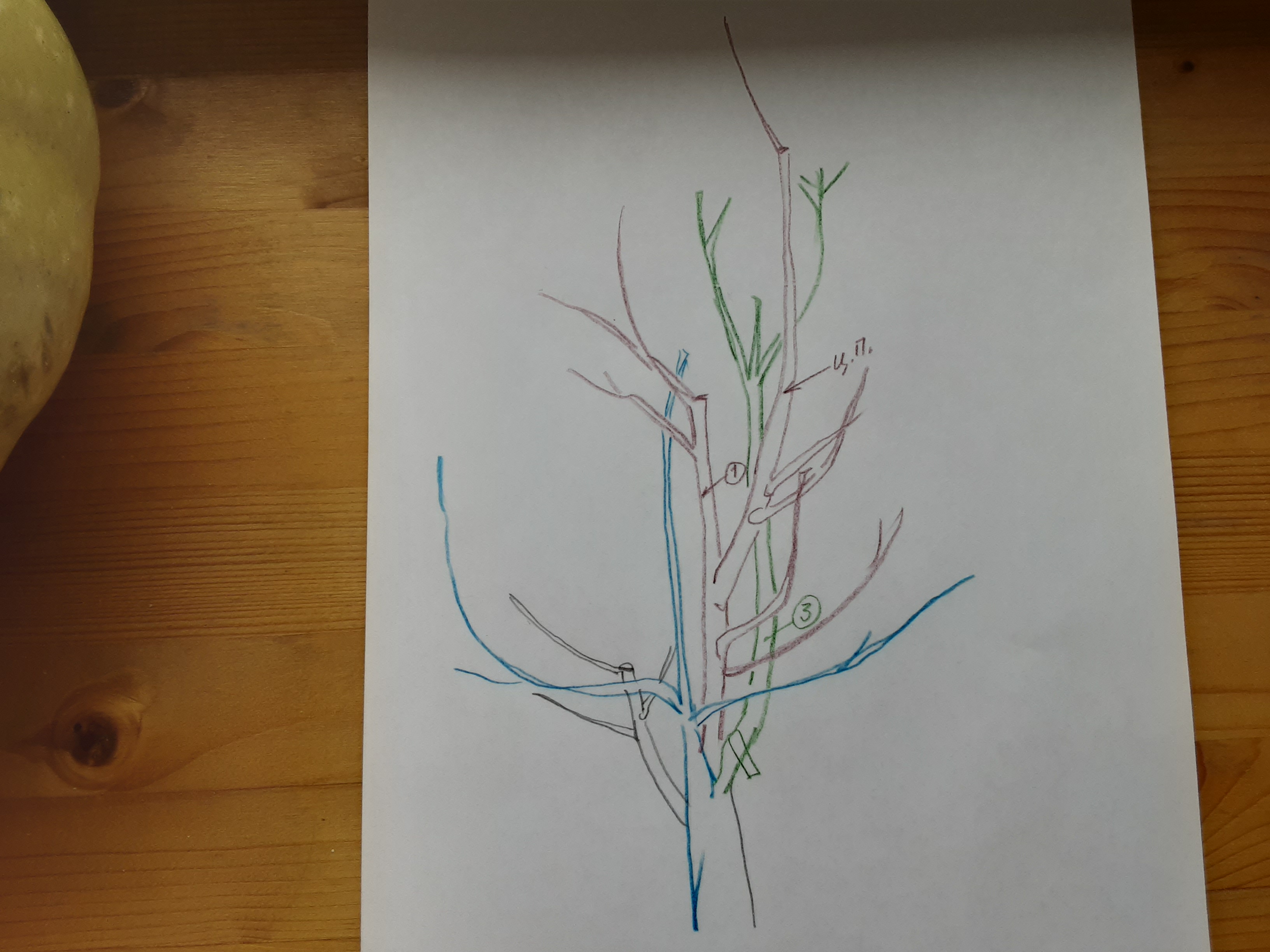 Возможен "обгон" лидера веткой 3, так как она более сильная. Тогда - загущение. Кажется, по генной программе Ваш сорт имеет пирамидальный рост, следовательно, ветвям надо придавать бОльший наклон, прирост срезать над почками, дающими побеги к периферии, то есть, "свобода" нужна, чтобы формировать, а тут - многоствольность. Не говорю, уж, об аэрации и инсоляции.