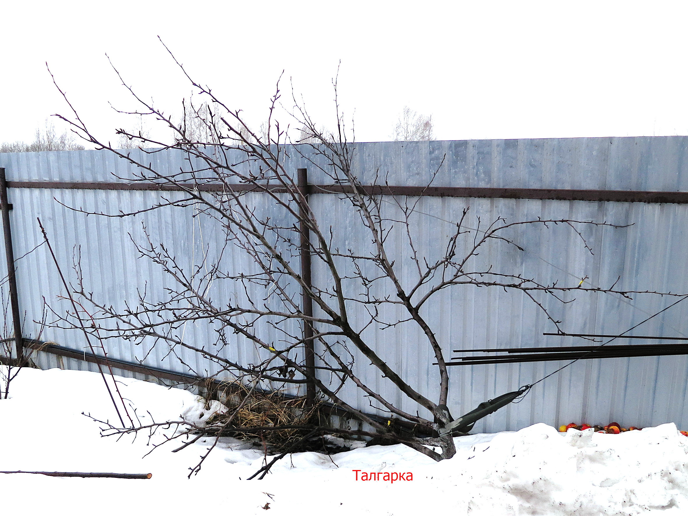 Может вторую ветку с низу на Талгарке удалить. Так по фото видно, что они одна над другой. Прирост годовалый чуть почикать. И ещё выше ветки зацепить и к забору подтянуть. Пытаться за пару лет выровнять вертикаль.