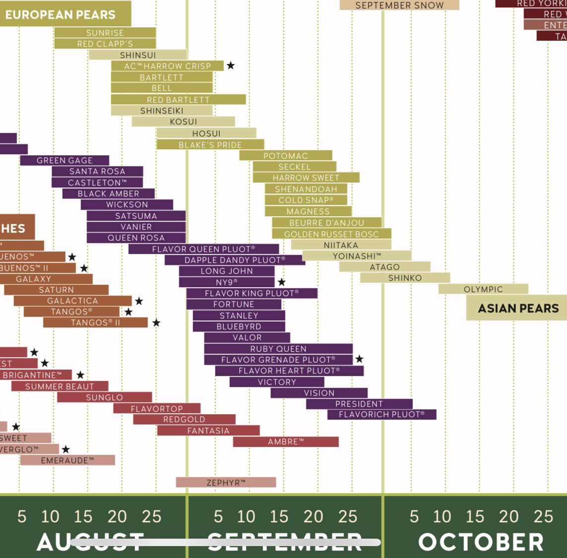 У меня сад на южном склоне холма, у знакомого на Северном. Расстояние между садами - километров 15 - 20 наверное. Разница в сроках созревания груш, черешни и т.д. в этом году порядка двух недель. Да ещё и по годам погода гуляет, 2 недели туда - сюда легко. Итого до месяца разница может быть. Все эти таблицы для определённой местности будут ну очень усредненными. Всё равно придётся смотреть по состоянию плодов по факту. Но зато страниц на 50 споры можно растянуть при желании