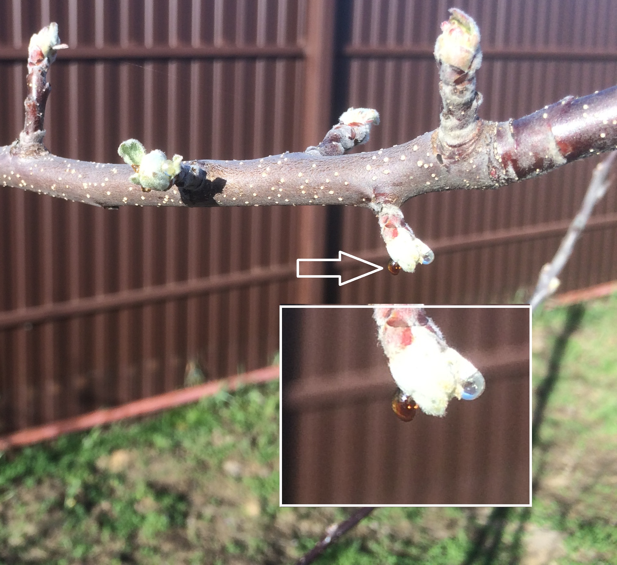 это явление наз. "плач почек" Его(цветоед или др.враги) личинка уже внутри, активно питается. В этом году плодоносить эта почка уже не будет.