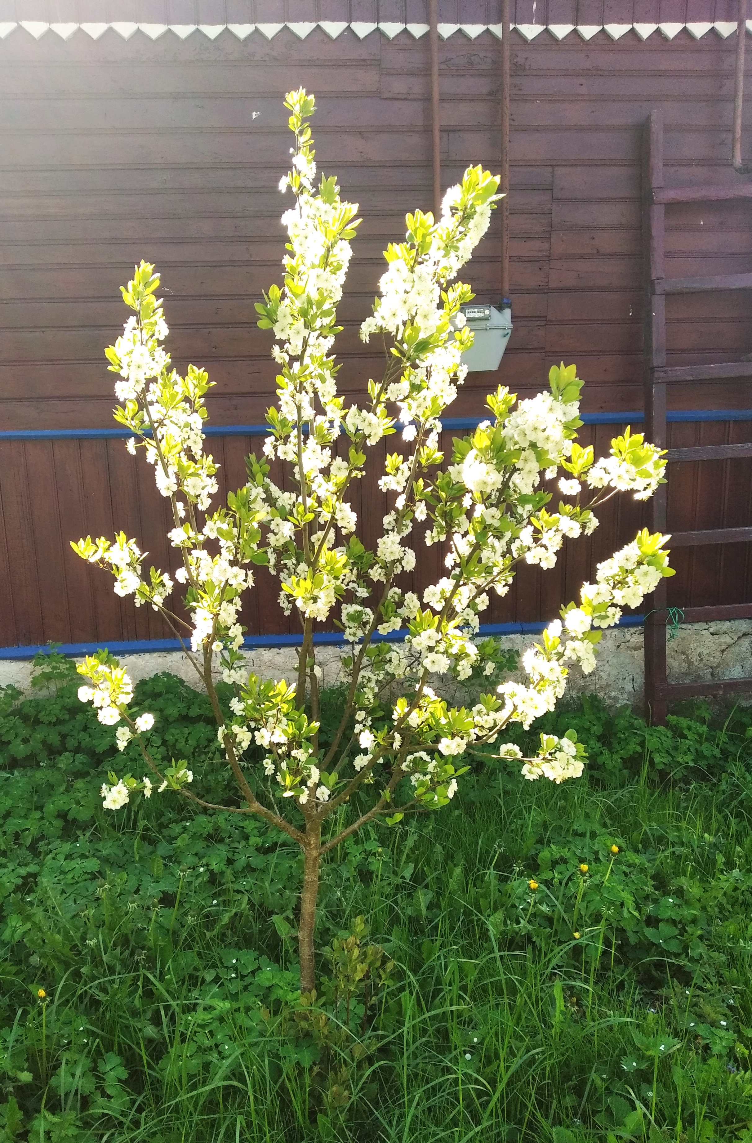 Так зацвела у меня ОЖ, которой максимум четвертый год, фото от 7 мая. Высота ок. 1.6 м. Выросла из поросли (не пересаживалась), может поэтому так быстро. Вообще поросли от ОЖ у меня как крапивы, постоянно скашивается вместе с травой, эта чудом уцелела.