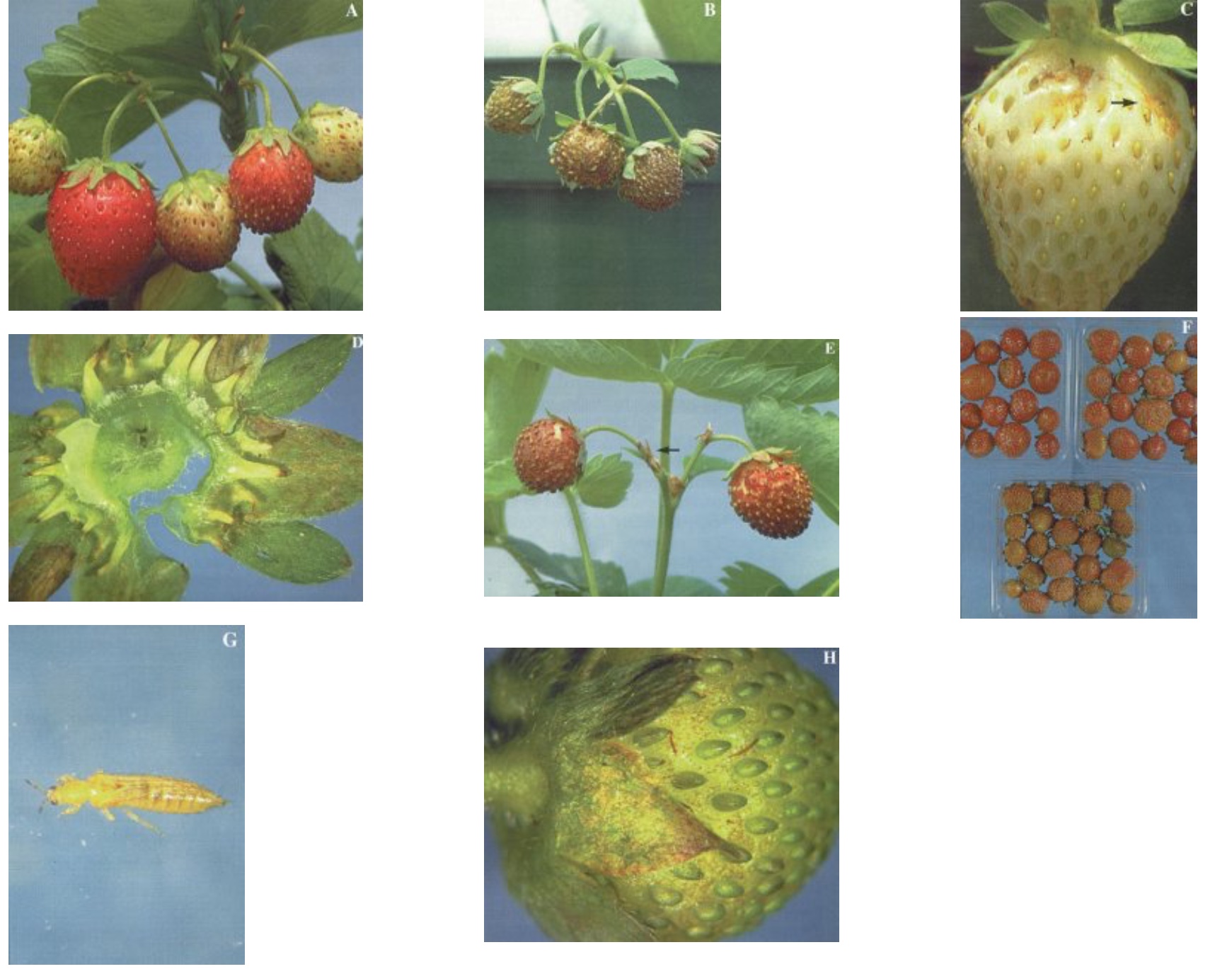 Трипса сейчас на землянике у меня нет, т.е. он мигрировал на цветы. А по ягоде я могу подтвердить слова Зульфии. Ягода на фото, на ощупь как резиновая, невкусная, при этом повреждения трипсом хорошо видны, некоторые семянки выедены.