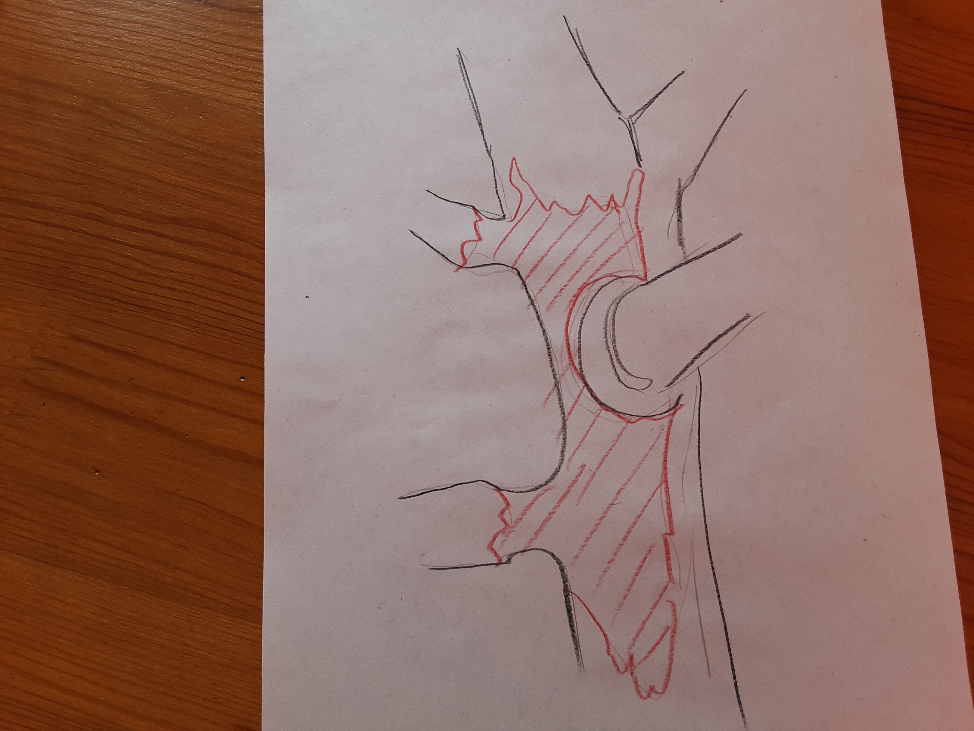 Можно снять ножом кору на участке, который красным цветом на рисунке.