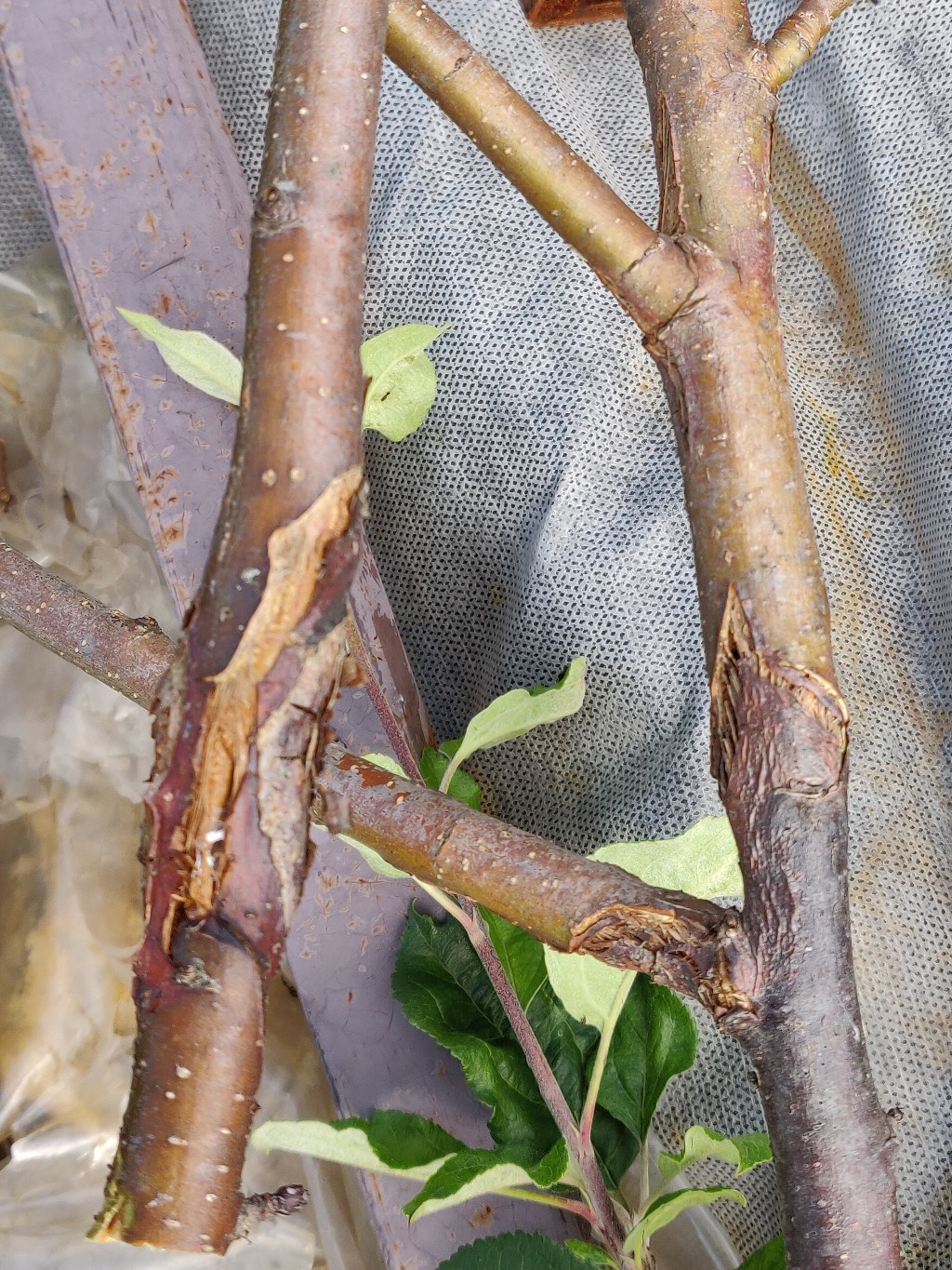 В этом году такая картина случилась с гр.Видная и яб.Б.Налив, растут рядом.Обратил внимание только, когда на листьях и ветках появились признаки похожие на бактериальный ожег и т.п.Зачистил кору на обоих деревьях до живой.Осталось по кругу на обоих деревьях не больше третьей части.Сделал по два черенка прививки на раны.Замазал варом,сверху пленкой.Обрезал больные ветки и сучья.Через неделю прыскаю, чередую антибиотики и противогрибковые.Поливаю,удобряю.Пошел здоровый прирост.Надеюсь вылечить.В прошлом году аналогичная история с Морозовской десертной, все получилось, дерево не узнать, крупный чистый лист,хорошие приросты, нет даже намека про болезнь.Zaryanka писал(а): ↑10.07.2021, 10:47 Екатерина1504, морозное повреждение на штамбе, в развилках(где вдавленные участки). Ещё весной на это неинфекционное поражение коры "сели" споры грибов. Получились инфекционные некрозы коры, луба, камбия, заболони. Кора и камбий постепенно отмирают(1-2 года). Будут такие "полосы отмирания".