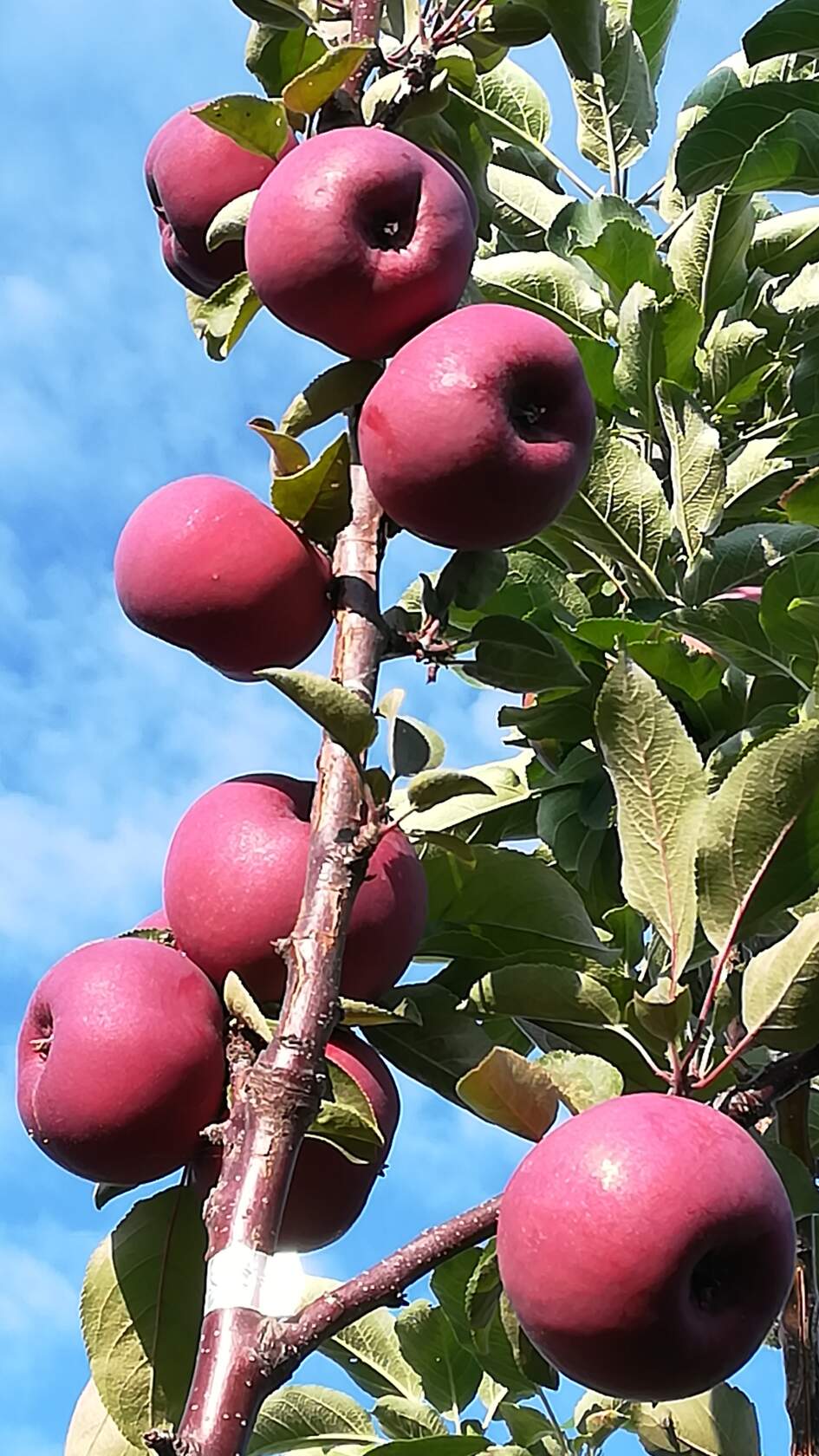 При том, что сорт не только выживает высоко в кроне зимостойких скелетообразователей, производных от видовой Я.Недзвецкого. Но и плодоносит уже на второй год. (Примечание. В зимы 2018-2019-2020 прививки не пригибал к земле, и никак не укрывал. Хотя ранее, сорт плодоносил только пригнутым к земле, и в контейнерах, с хранением в подвале). Ниже пример плодоношения таких прививок. На фото английский сорт колонна антоциановая Maipole (McIntosh Wijcik × Baskatong), сезон 2020