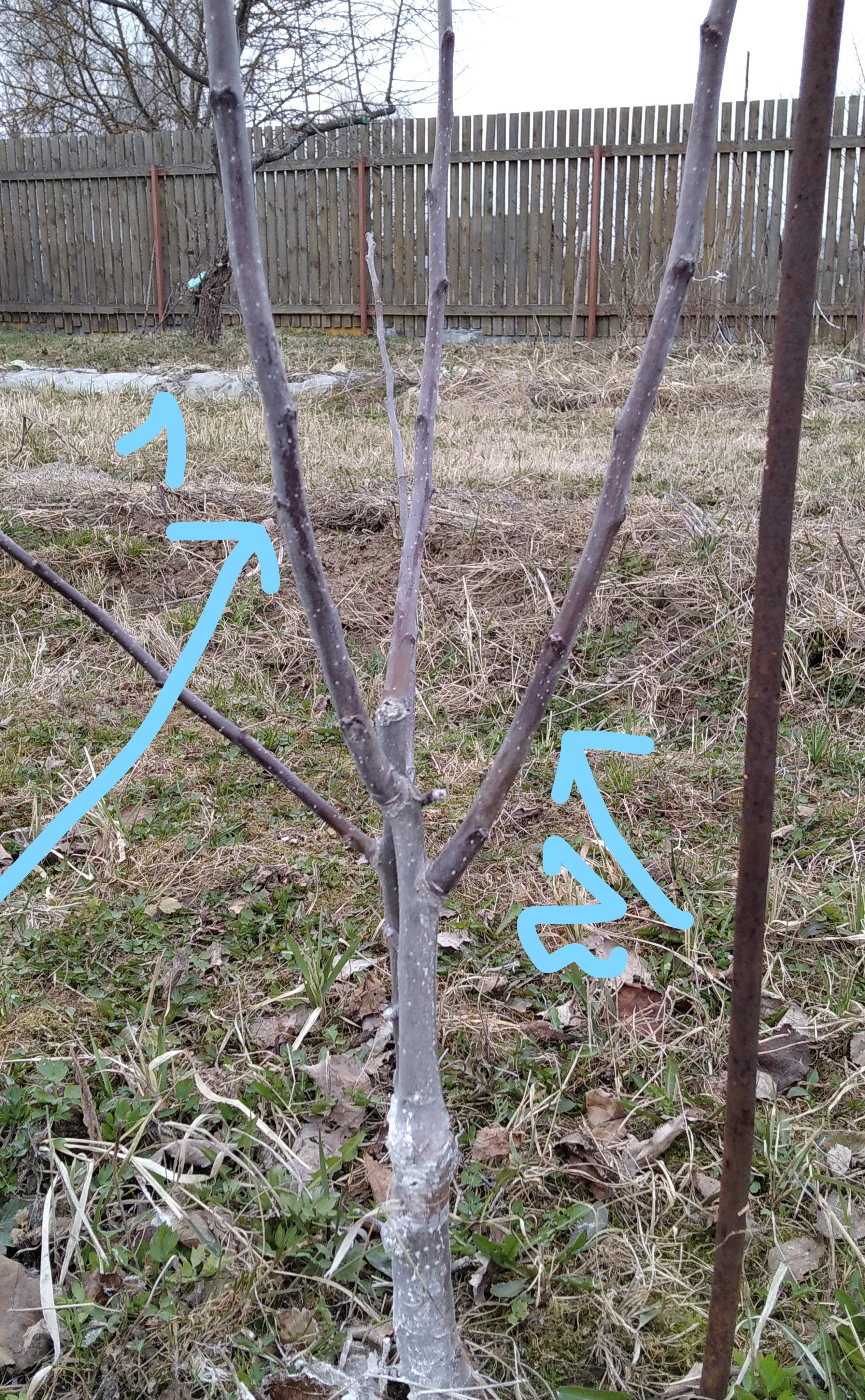 Прошу совета у профи. Яблоня старая, вертикальная привитая ветка опирается на более тонкую ветку. Насколько можно обрезать тонкую ветку слева, чтобы не рухнула вертикальная ветка? В прошлом году уже укорачивали левую ветку, можно ли еще наполовину ее срезать.