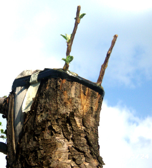 На терне именно прививки врасщеп у меня рванули в росте за лето прилично. Топорик или долото там пригодятся и клинышек временный тоже нужен чтобы щель не смыкалась пока черенки вставляете. Все замазать варом и сверху и сбоку и замотать изолентой . А там как повезет