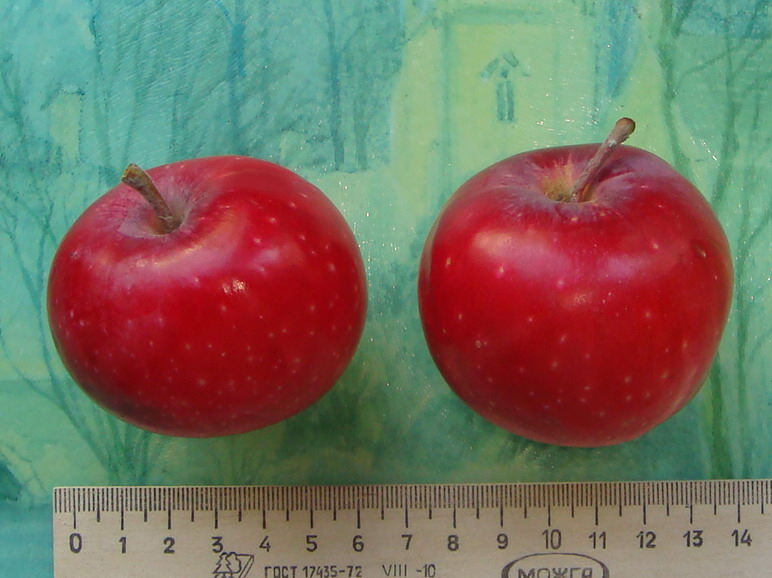 Плоды вышесредней величины, одномерные, уплощенно-округлые, правильной формы, иногда слегка скошены. Поверхность гладкая, основная окраска при съеме – зеленая, покровная – размытая, буровато-темно-красная с сизым налетом по большей части плода. В потребительской зрелости основная окраска светло-зеленая, покровная – красная, размытая, подкожных точек много, крупные, светло-зеленые, хорошо заметные. Мякоть мелкозернистая, кисловато-сладкая, в хранении сладкая. Плоды хранятся до января, потолок - до февраля.