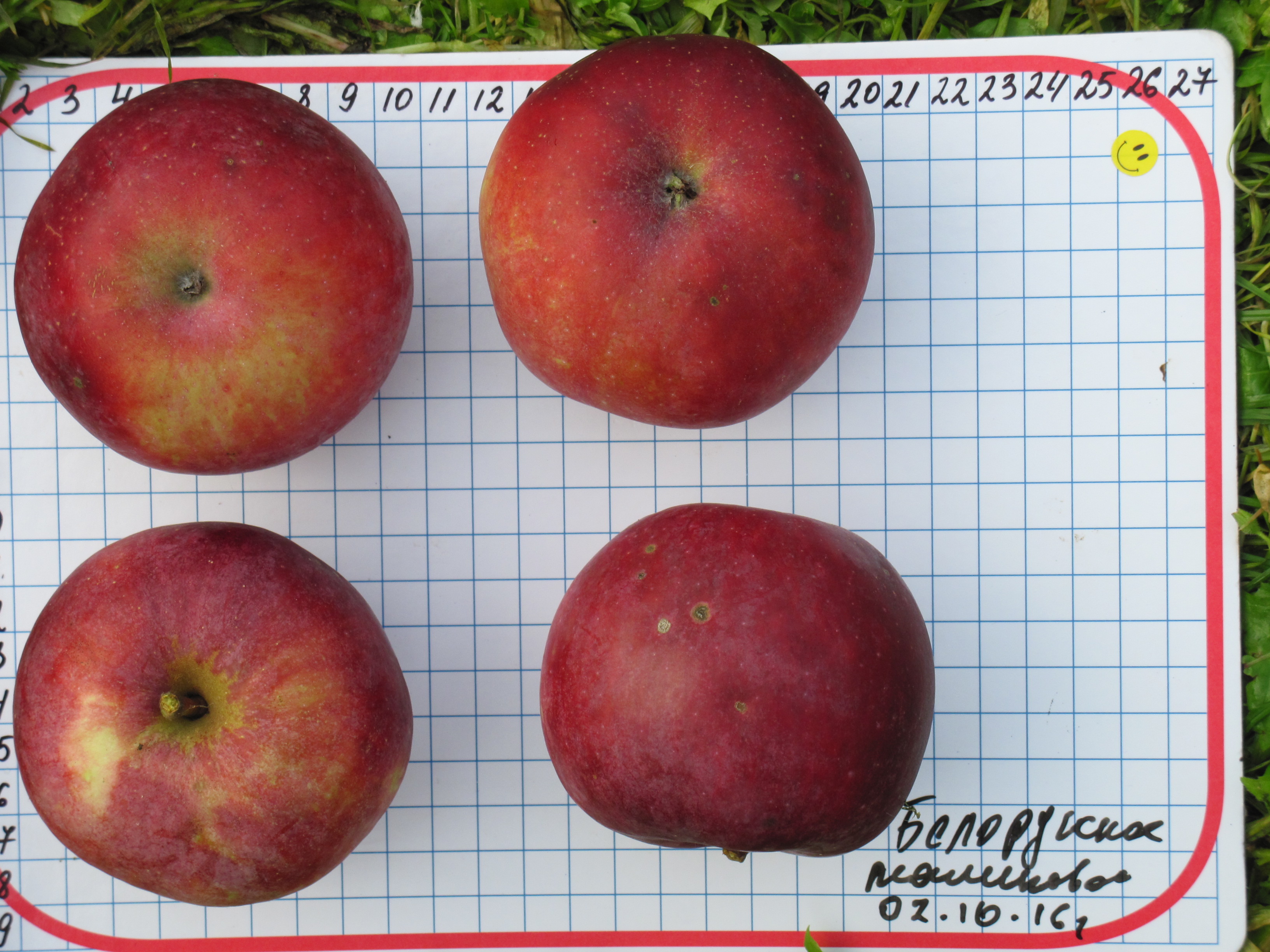 Сорт селекции Белорусского НИИ картофелеводства и плодоовощеводства. Создан в Лошице (Минский район). ГК СССР – 1974 г. В Государственный реестр сортов и древесно-кустарниковых пород Республики Беларусь включен с 1991 г. Зимостойкость хорошая (чуть ниже Антоновки), устойчивость к парше слабая (поражение листьев – 3,1 балла, плодов – 3,0 балла), к плодовой гнили хорошая. Плодоношение наступает на 4 - 5-й год после посадки. Урожайный (с возрастом урожайность увеличивается), со склонностью к периодичному плодоношению. Плодоношение сосредоточено на копьецах, плодовых прутиках, но в основном на кольчатках. Лучшие опылители - Антоновка, Уэлси, Лавфам, Минское. Сорт хорошо зарекомендовал себя в Белоруссии и Прибалтийских республиках. Дерево сильнорослое с приподнято-округлой загущенной кроной. Основные ветви отходят от ствола под углом 40°, но срастание их прочное. Листья крупные, яйцевидной формы, темно-зеленые, кожистые, с блеском, с небольшим скрученным кончиком и сердцевидным или округлым основанием. Край листовой пластинки городчатый, крупноволнистый. Плоды около 100 г., неоднотипные, плоско-округлой и округлой формы. Основная окраска зеленовато-белая, покровная - в виде малиновых, сливающихся в сплошной румянец полос почти по всей поверхности плода. Кожица гладкая, покрыта интенсивным сизым налетом. Мякоть с кремовым оттенком, средней плотности, мелкозернистая, сочная, кисло-сладкого вкуса. Съемная зрелость наступает в конце сентября, плоды сохраняются до середины мая.