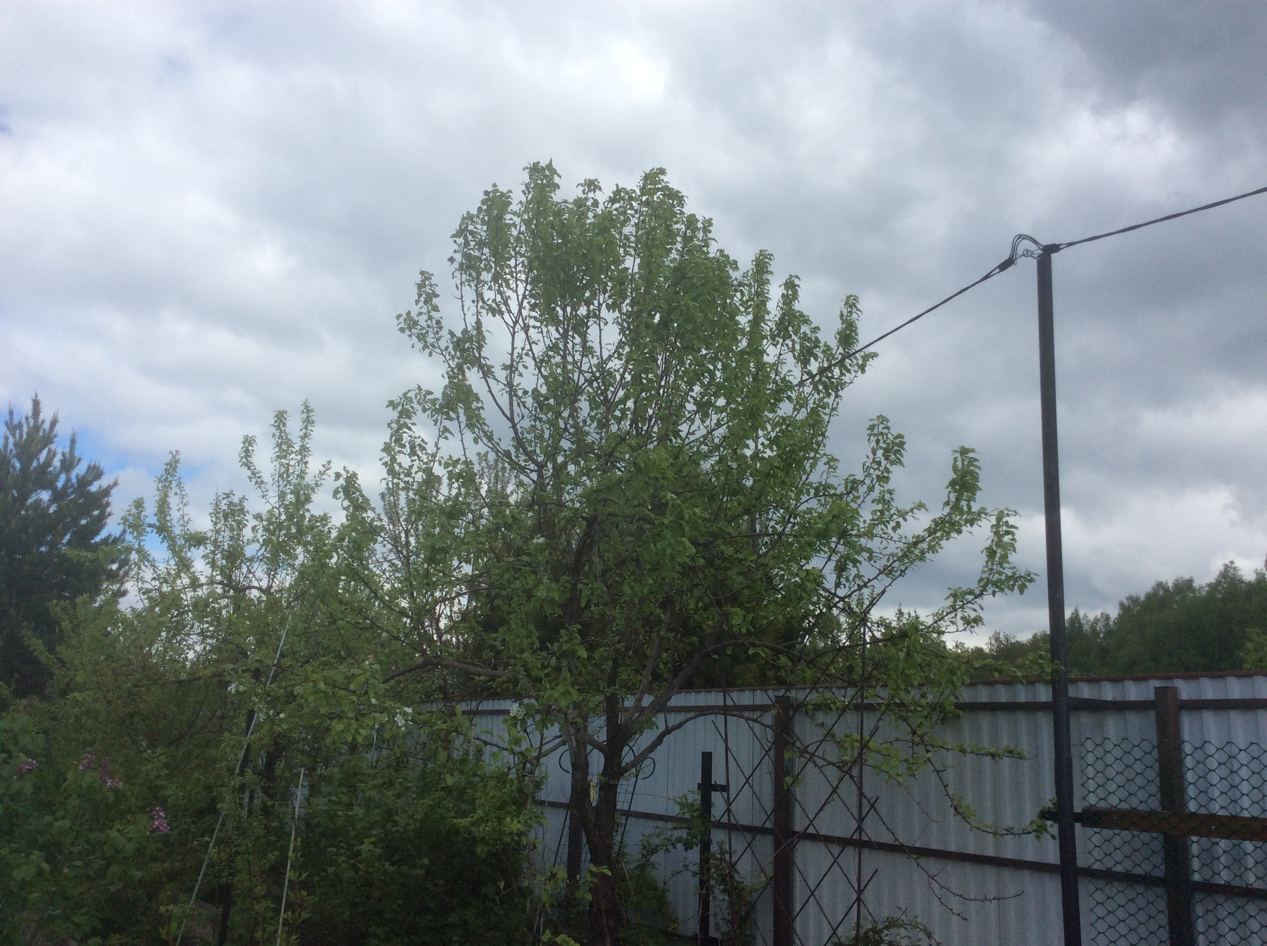 Растущее отдельным деревом Алеся сильно пострадало. Выломало два нижних яруса скелетных ветвей. Из-за вырывания их с "корнем", штаб сильно ослаб, так,что проводник и ветви верхних ярусов пришлось сильно подрезать. Так, что цветение единичное. В отличии от других сортов листья развиваются с заметным "торможением".