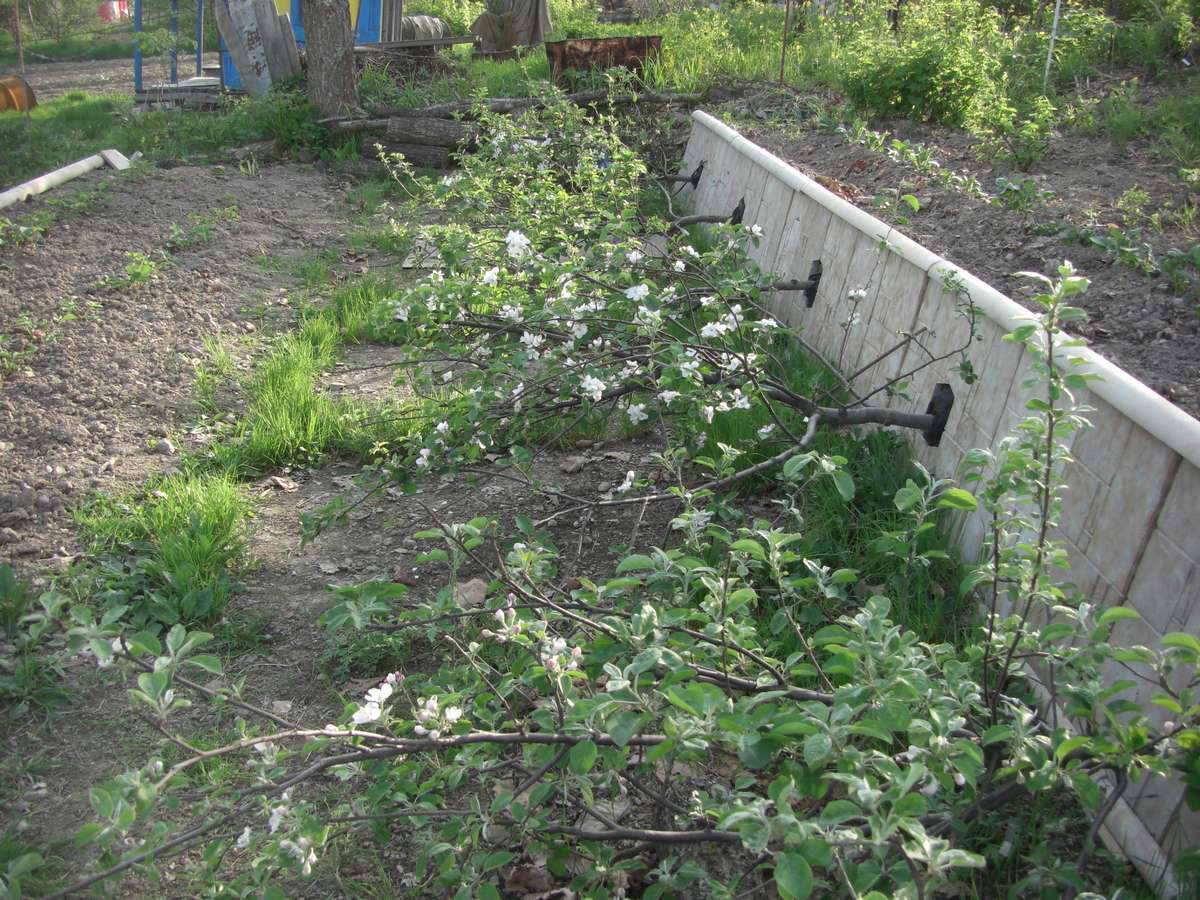 Такое решение благодаря склону. Приходится недостатки оборачивать во благо. Подпорная стенка служит частью укрытия на зиму. Кроме того посадка, как я называю, блоком, позволяет укрывать весь ряд одним укрытием. У меня два таких блока. С сорняками под кронами никак не борюсь. Всё застлал листами оргалита. Достались по случаю не кондиция. Можно для этого и банеры бу использовать. Тоже хороший вариант. Только их надо проволочными скобками пришпиливать, от ветра. Черные втулки это чёрный геотекстиль, куски вставлены при посадке чтобы земля не высыпалась в отверстия в бетонных плитах которые оставлены с запасом под штамб по диаметру. Карликовые вставки позволяют держать деревца в малых габаритах.
