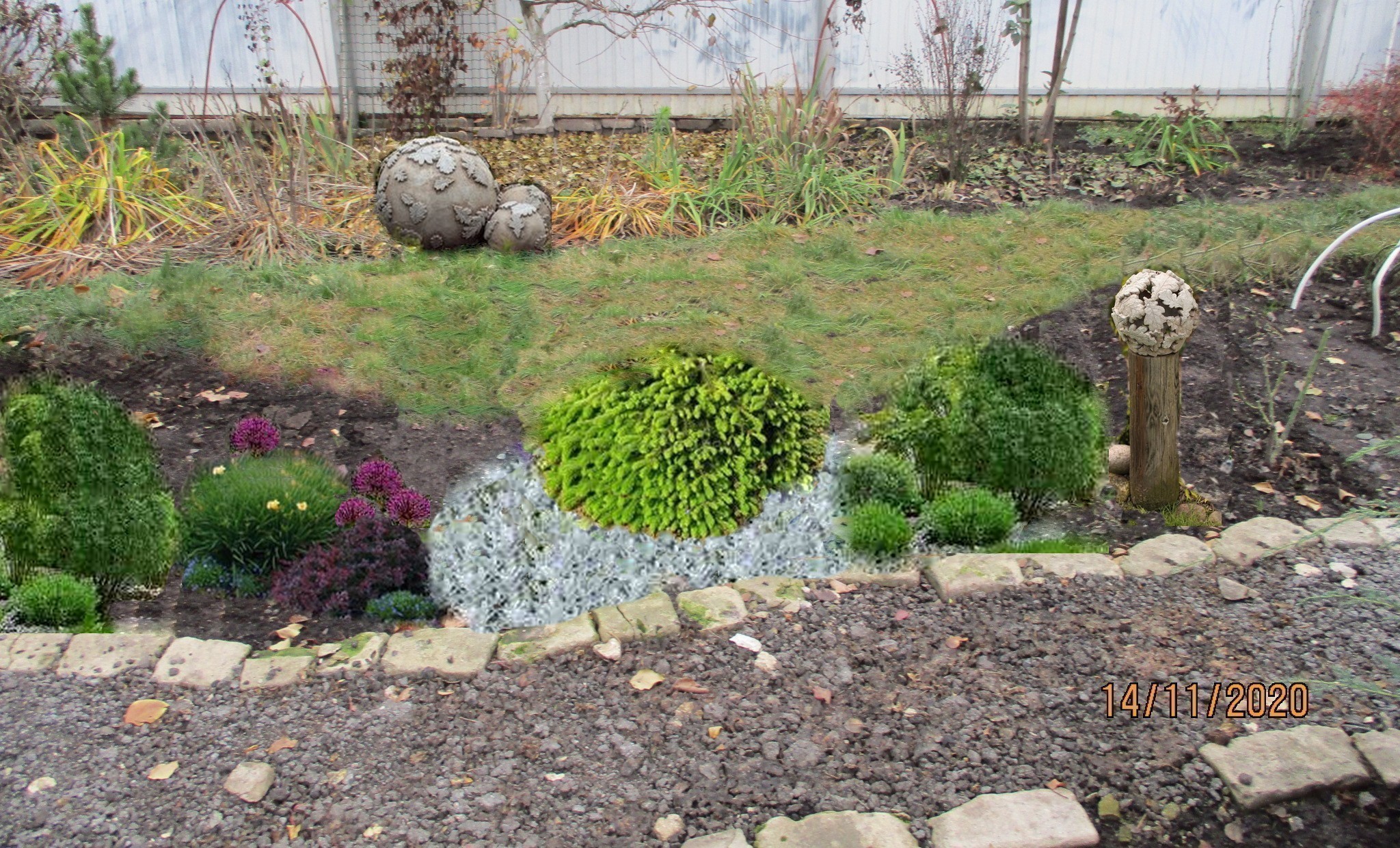 Потом я рассмотрела на фотографии с мискантусом (за ним же просматривается это место?), что у тебя там (около забора) еще есть красивое графичное дерево. Справа, слева растут можжевельники? Около забора есть сосенка (какая?), какие-то кусты сидят(перечисли).