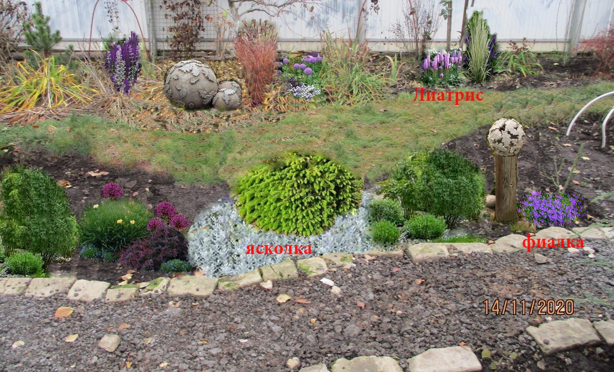 Моя любия клумбочка - это рокарий. По центру немного высоких, а вокруг почвопокровники. Но у тебя нужно больше высоких, чтобы соединиться с розой. А что там за розой и ёлкой? Может, с ними нужно тоже сочетаться?
