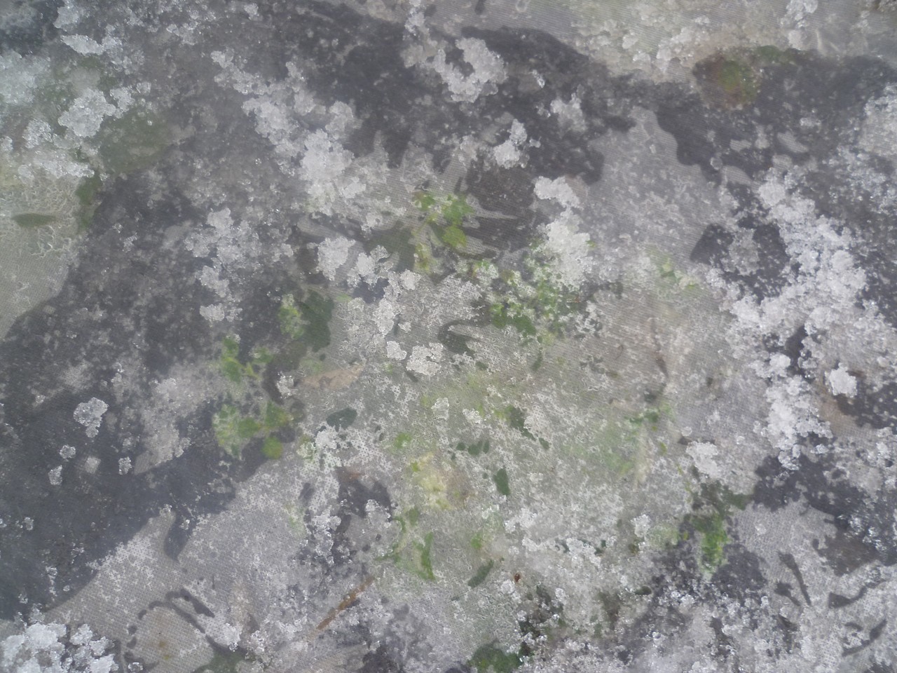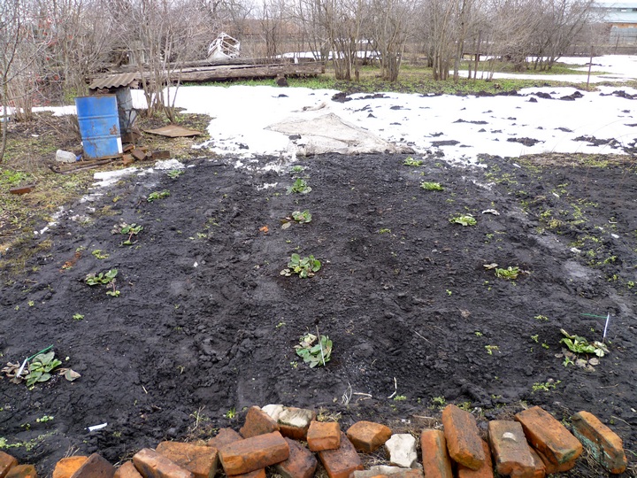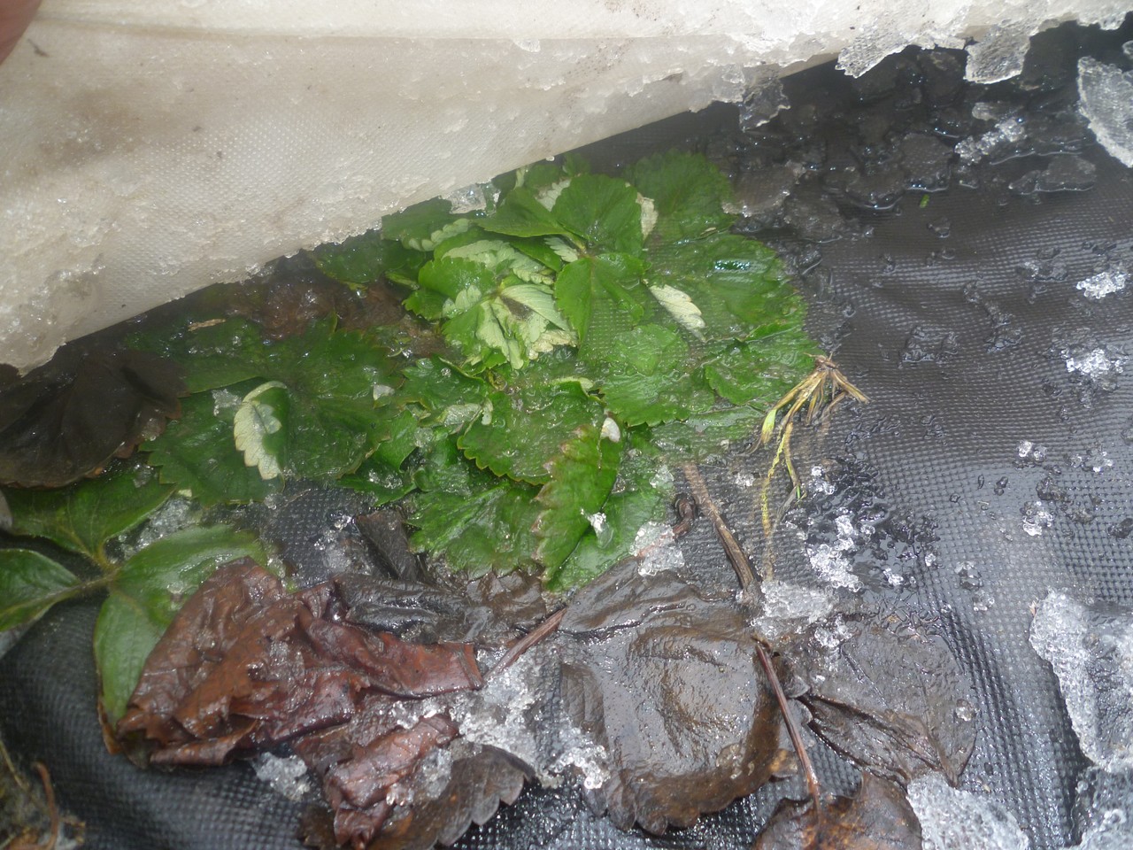 Был сегодня в деревне. Снега значительно поубавилось, одна грядочка земляники у забора оголилась. Не утерпел, отодрал примерзший кусок спанбонда, которым укрывал грядку и заглянул внутрь.