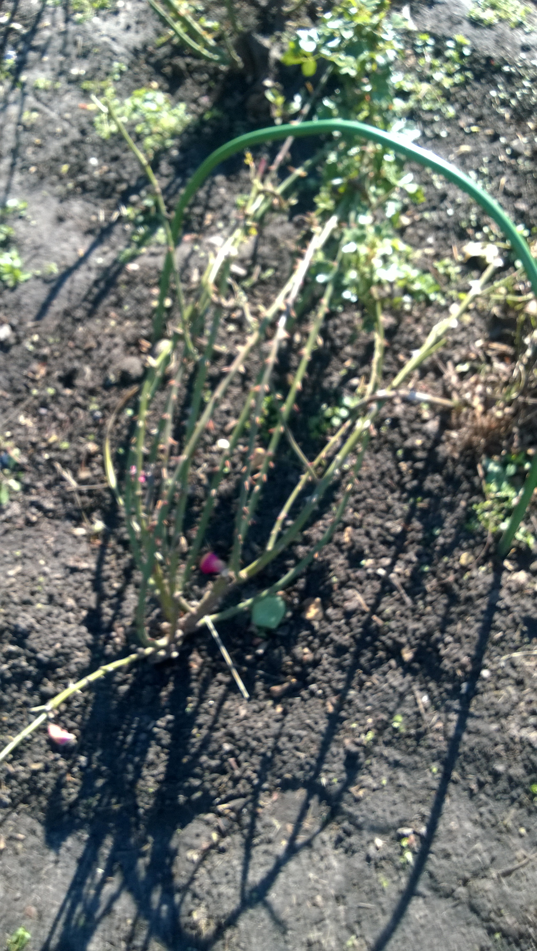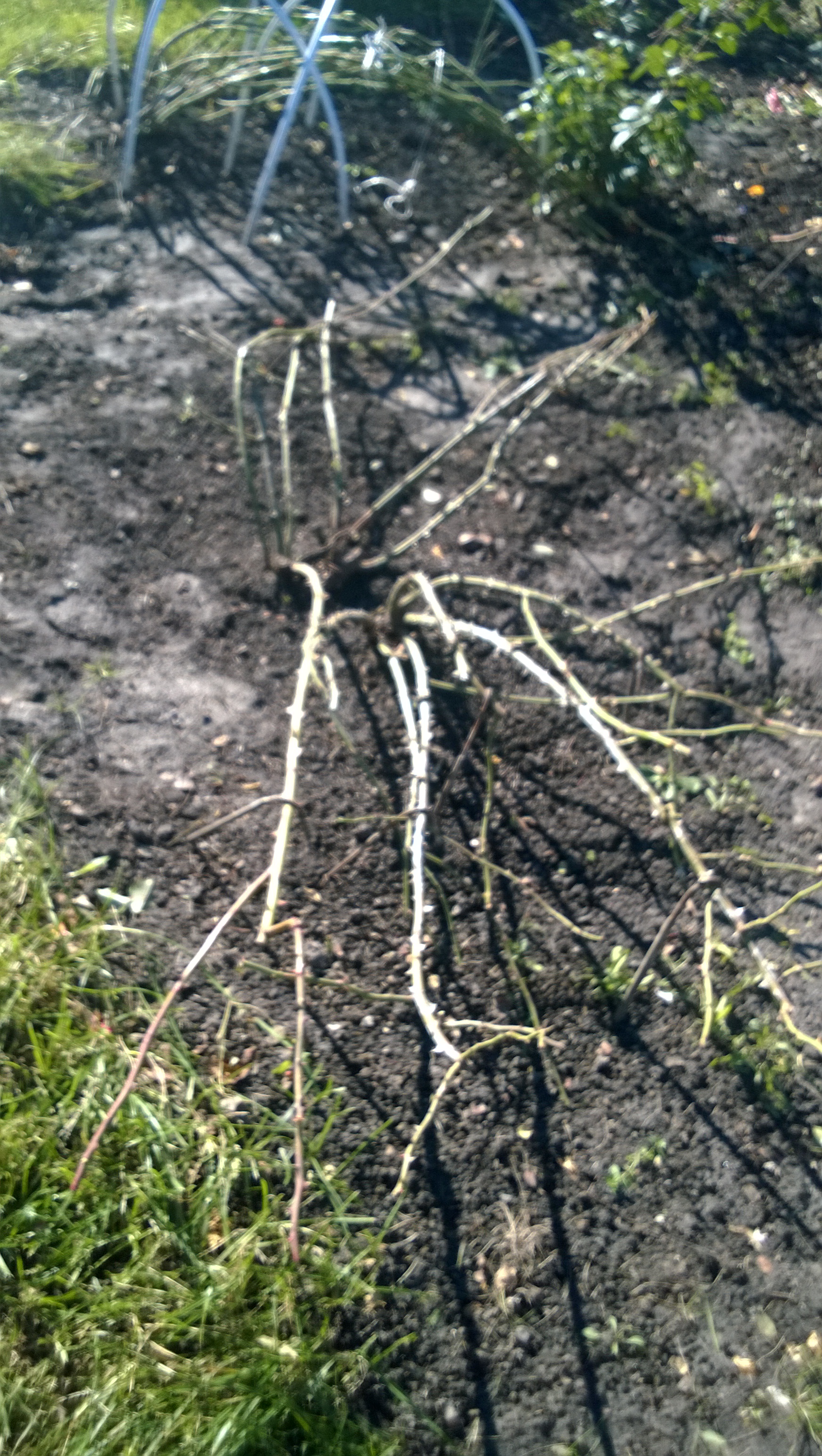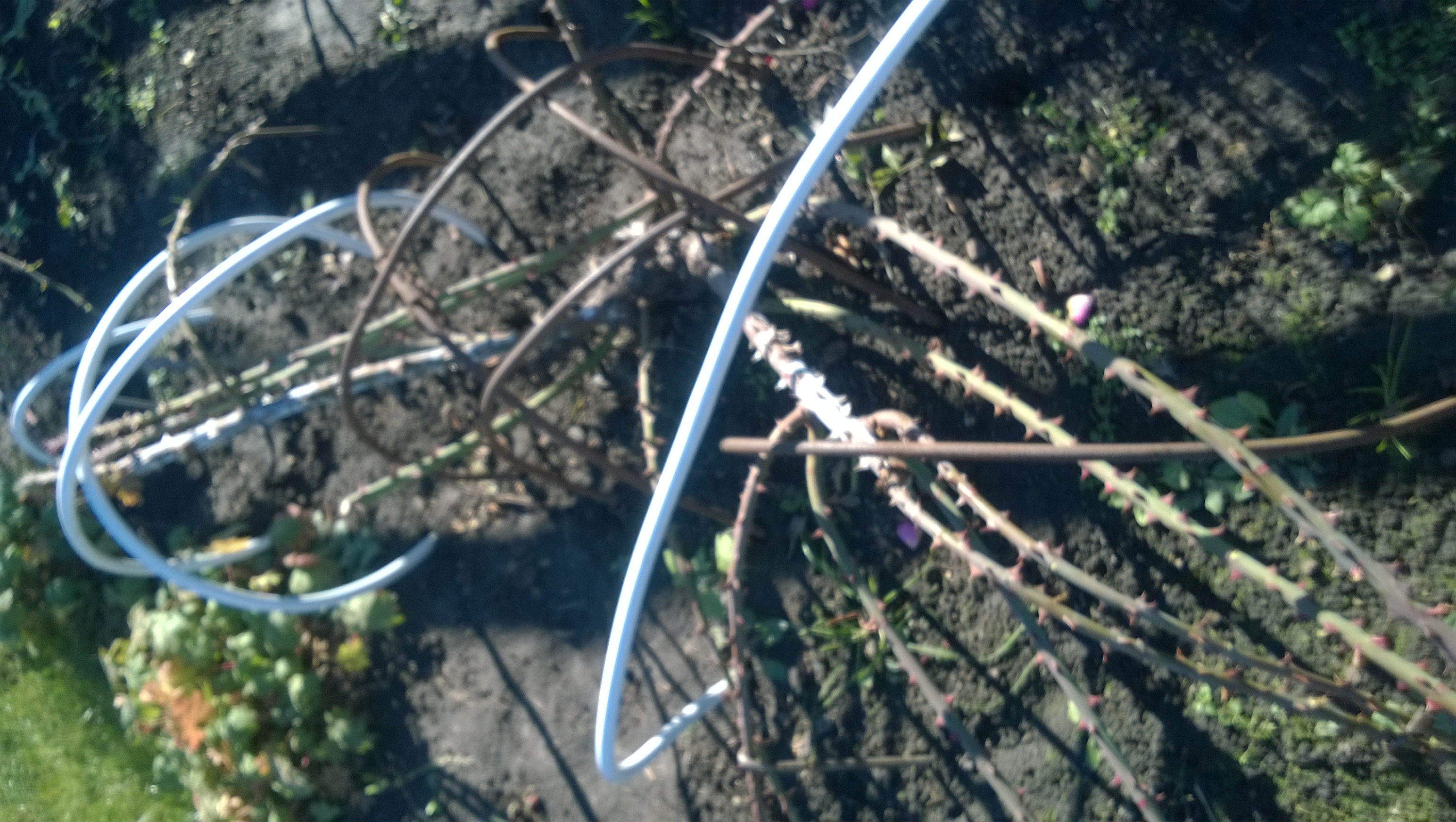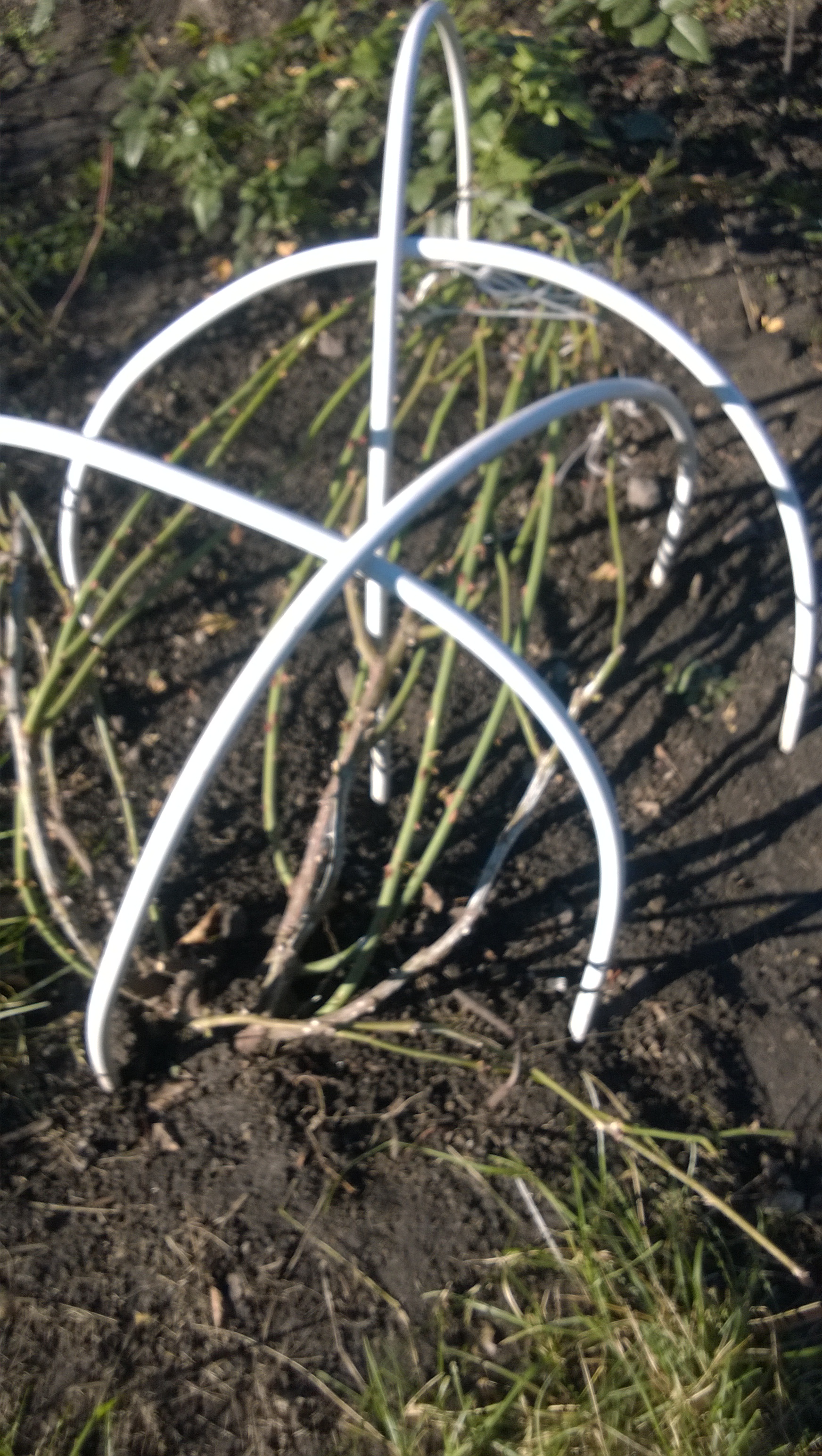 У нас сегодня было -6. Хорошо,что розочки все пригнула. Остался укрывной. Часть роз с дугами, но не всем досталось. Расставлю между ними старые ведра.