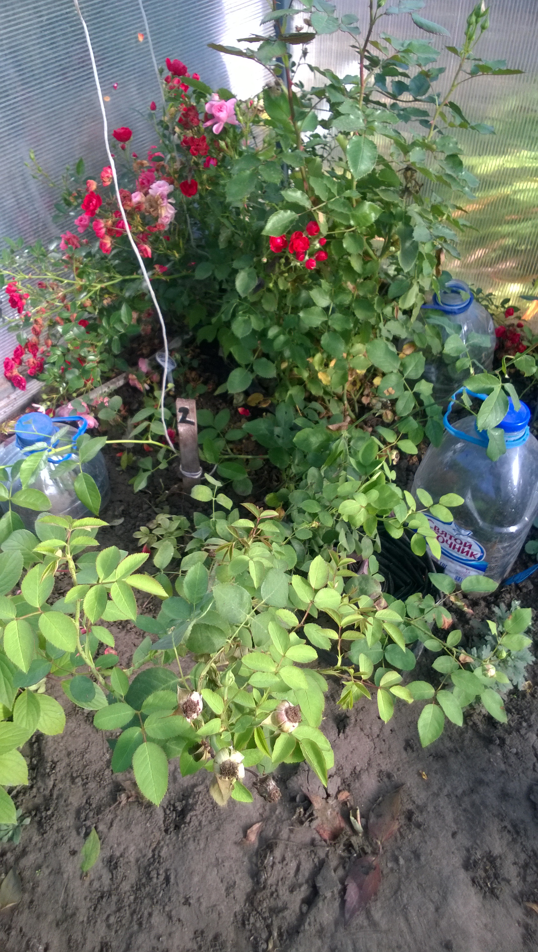 Я бы сама лично сделала так: прикопала бы горшочки в розарии. Сверху 5 литровые бутылки ,обрезать дно.На них лутрасил. И на розарий естественно лутрасил. Можно бутылки слегка присыпать землей. Пусть зимуют вместе с розами.