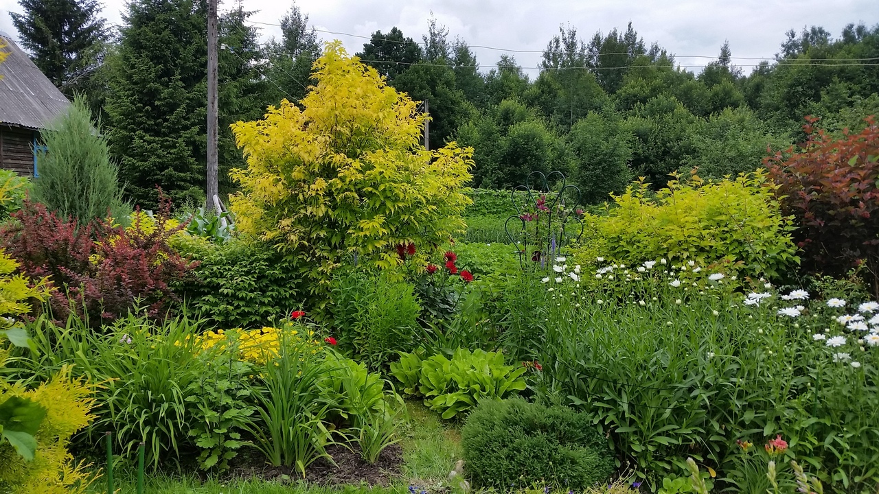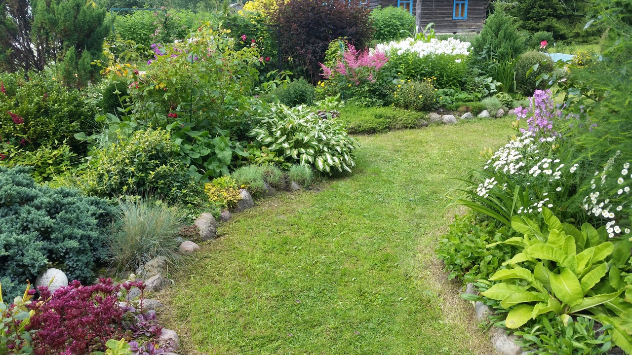Тоже скажу. Прям, отдыхаешь на её фотографиях. Так для глаз приятно...скользить, как по волнам, по плавным изломам профилей ее миксбордеров. С любой точки: хоть, от главного входа, хоть с огорода, отовсюду - нарядно. Извилины такие свободные, собираются в красивый узор. И доминанты-кусты везде - к месту. Они все многоцветные, воздушные "змейки", как бы, к земле "пришпиливают", не давая им "разбежаться", собирая их в "кучки". :-)