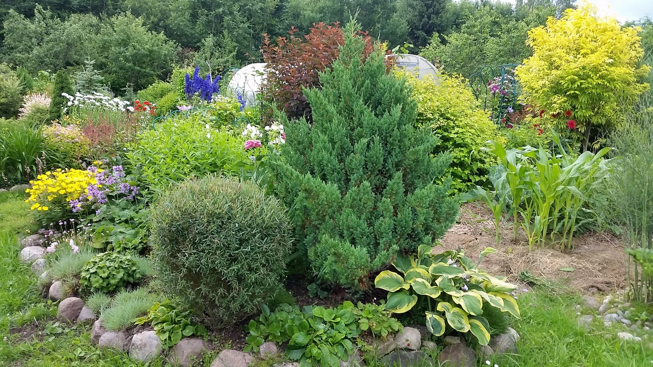 Это же место, только чуть другой ракурс в 2022 году. Бузина кистистая Плюмоза Ауреа вымахала больше 2-х метров, можжевельник скальный Блю Эрроу стал красавцем...