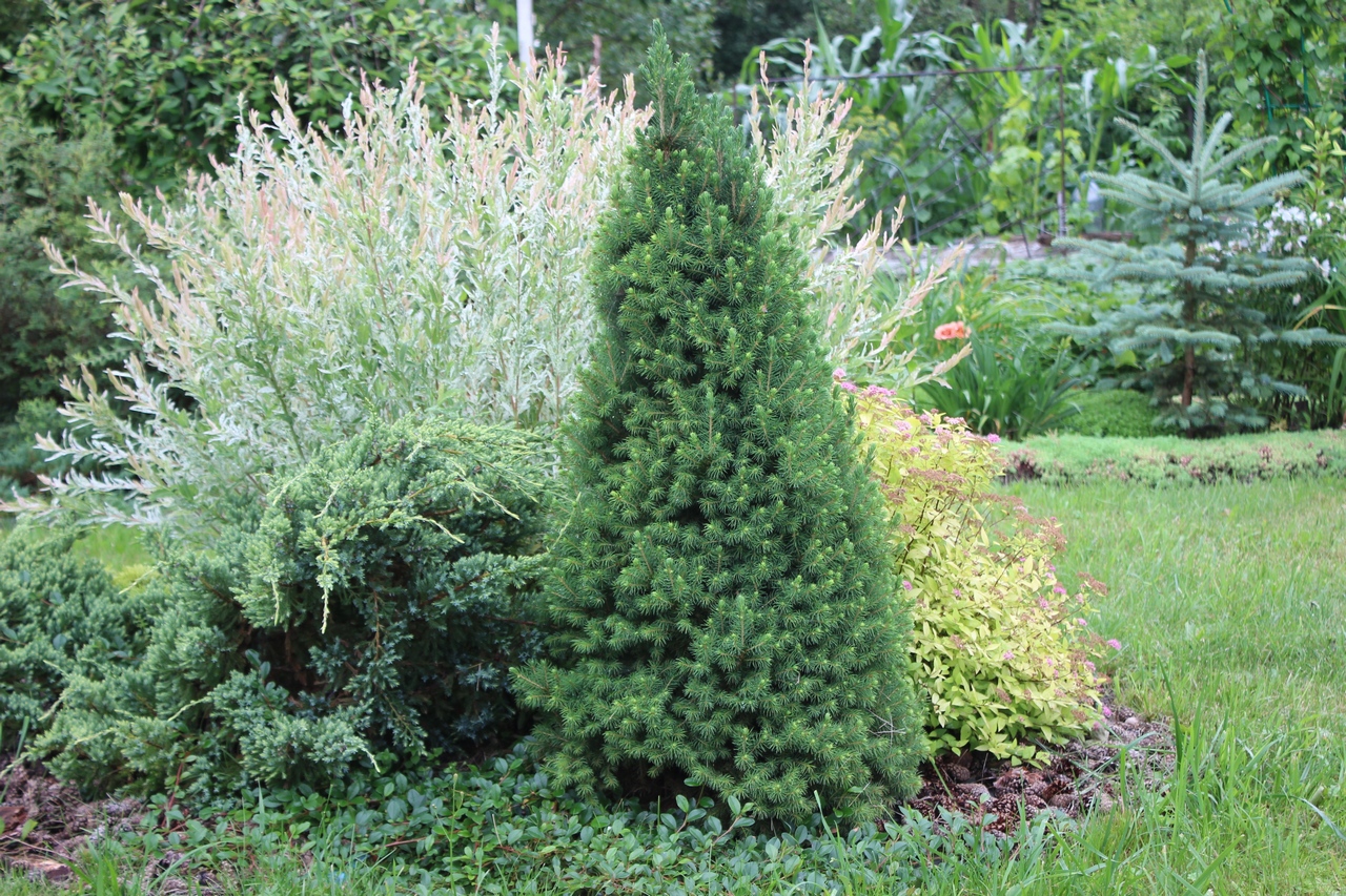 У елей поверхностная корневая система, и корни уходят очень далеко в стороны, по крайней мере, у высоко- и среднерослых сортов. Поэтому сажать рододендроны близко от елей - плохая идея, ели будут угнетать рододендроны. А вот соседство сосен или туй для рододендронов - хорошо, т.к. и у тех и у других корни не расползаются в стороны. У большинства видов можжевельников корни тоже сильно идут в стороны на небольшой глубине.