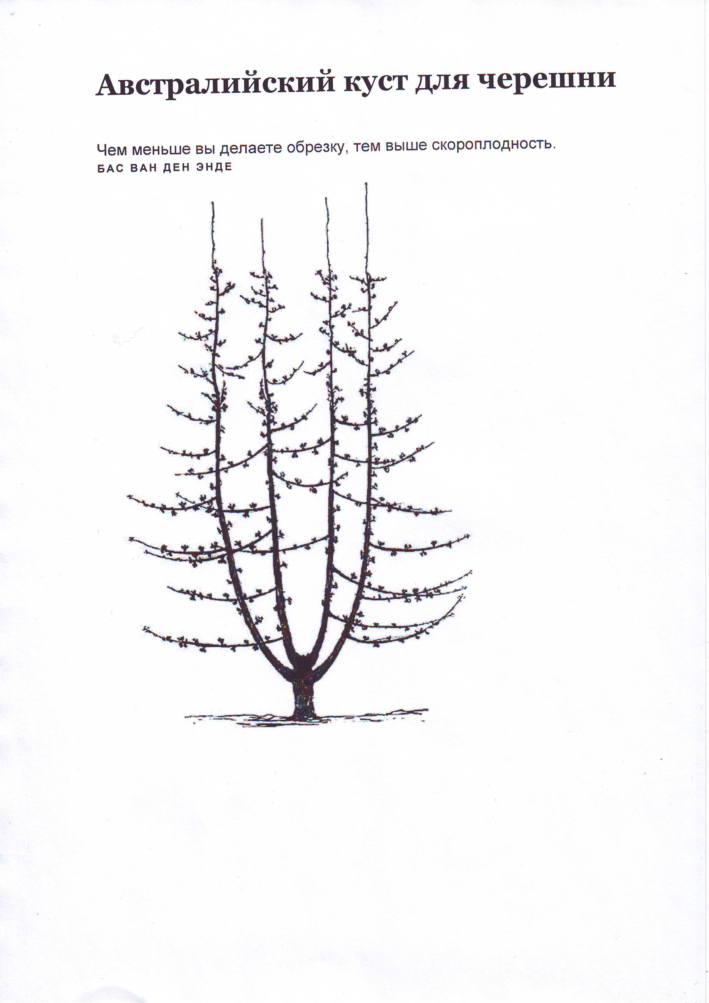 Добрый день! Странно! Мы с Вами подняли разговор об обрезке черешни по типу Австралийский куст". И никто не подключился к обсуждению. Многие на этом форуме жалуются на высокий рост черешни (птичья вишня! Все съедают скворцы!), на поздние сроки вступления в плодоношение (на 5-6 год!), а такую обрезку обходят стороной.Владимир из Н.Новгорода писал(а): ↑05.03.2020, 10:17 Корявый перевод но это лучше чем бредни опубликованные на Российских сайтах ворами. И вообще когда вы ищите в интернете вы забиваете в поисковик Австралийский куст. Вы что думаете что Бас ван ден Энде специально пишет для вас на русском языке и размещает свою статью в интернете. Он даже не знает о вашем существовании. Чтобы найти его статьи для поиска надо написать в гугл переводчике "Австралиский куст" и он выдаст на английском "Australian bush". И это Australian bush надо поставить в поисковик.