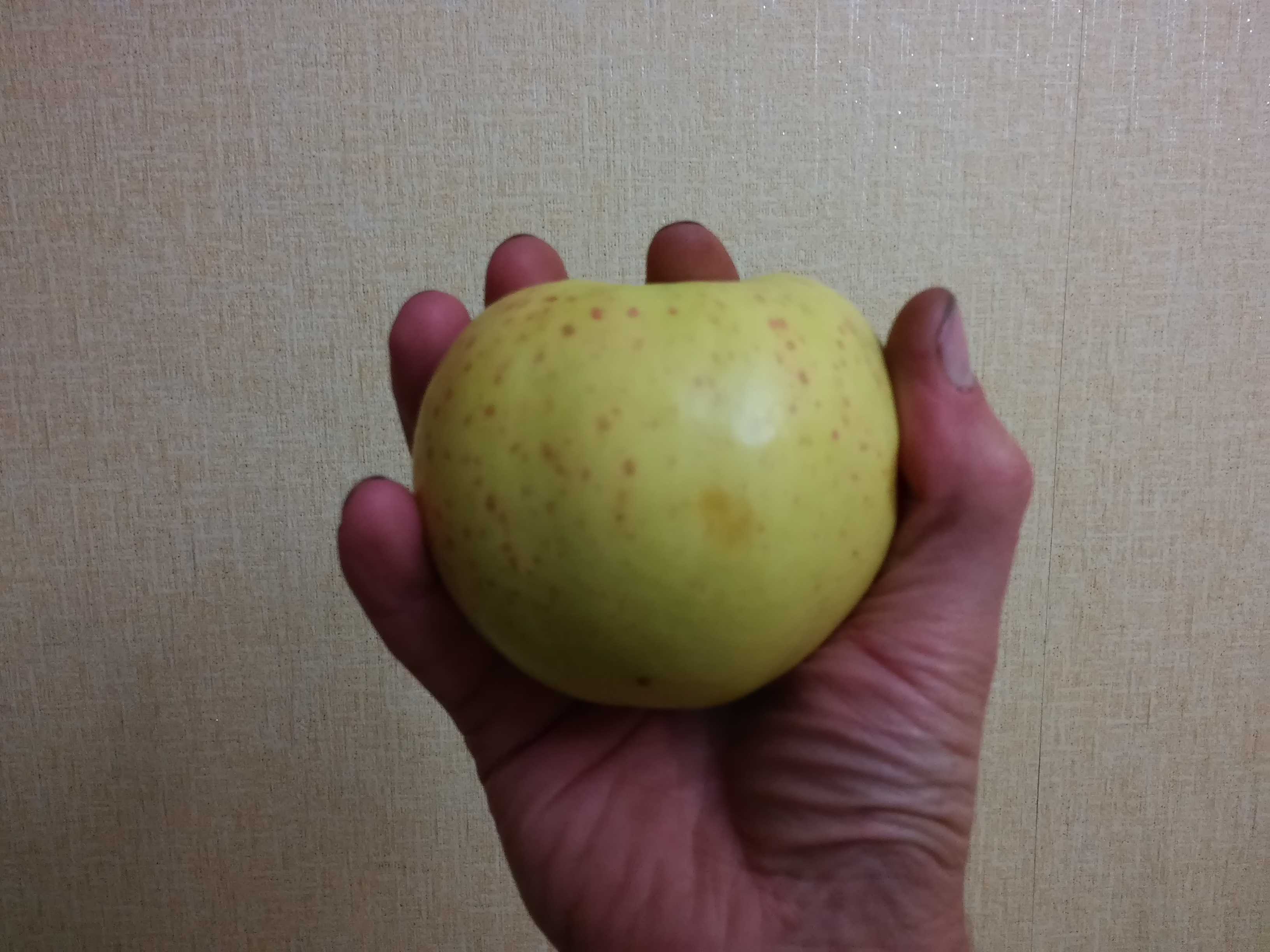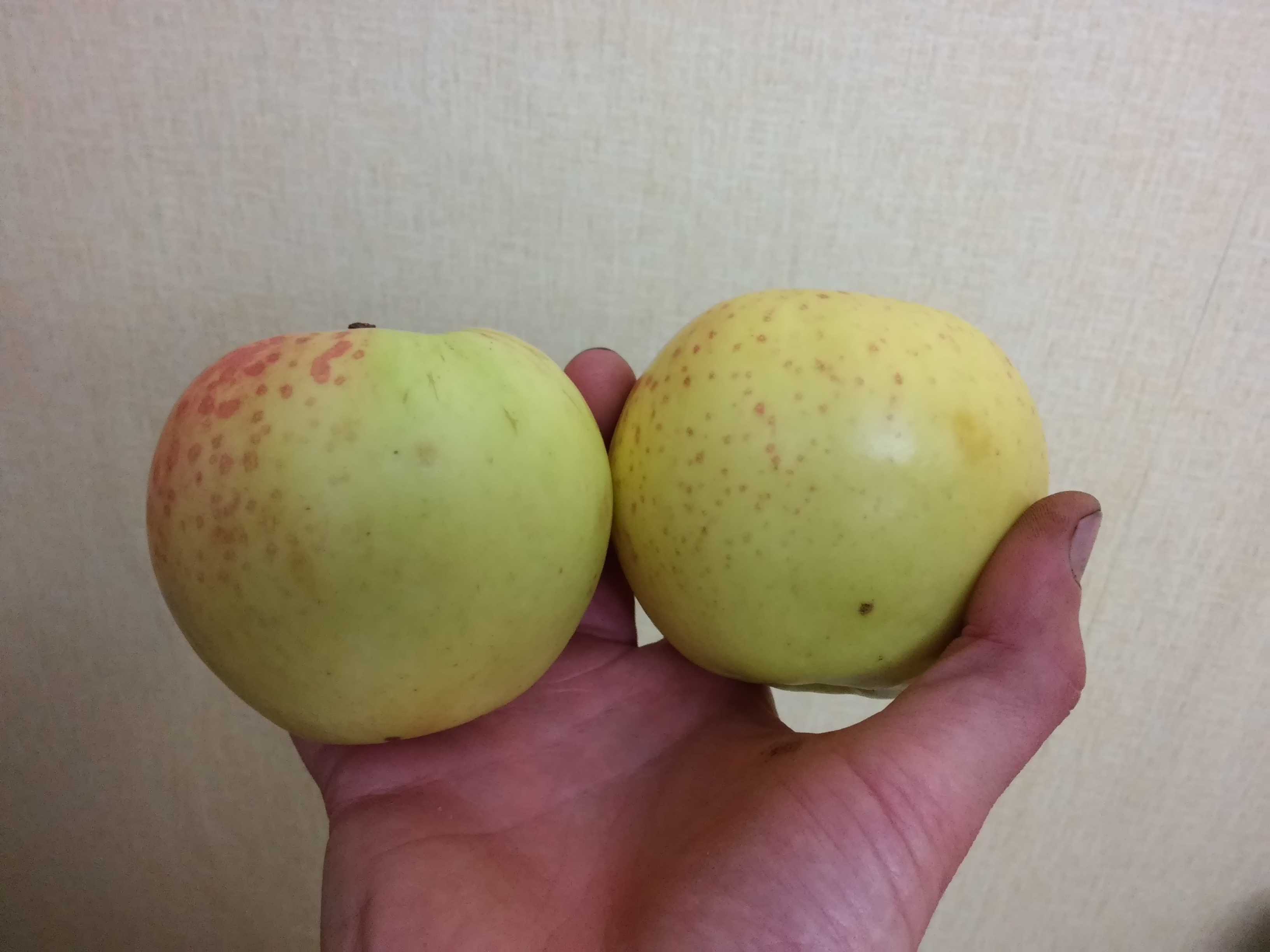 Здравствуйте форумчане! И я спрошу. Прилагаю фото яблока. Цвет сначала светло-зеленый, потом когда поспеет, становится почти светло-желтым (светло-желто-зеленое), с небольшим румянцем на боку, румянец не сплошной, а маленькими пятнышками (веснушками) пятнышко не сплошное, внутри пятнышка светлая (желтая) серединка, на румянце прослеживаются слабые бледные вертикальные полоски. Диаметр крупных яблок 8 см, такие крупные яблоки обычно в самом верху, где много света в кроне яблоки мельче, форма яблока обычно приплюснута слегка коническая книзу (низ - это я имею ввиду там где был цветок, а верх - черешок) Вкус сладкий, с очень слабой почти не заметной кислинкой, как-бы с грушевым привкусом, кислоты больше в середине на огрызке, мякоть белая, не рыхлая и не хрустящая, как-бы ватная (особенно у неспелых яблок), яблочный аромат слабый, сильнее от мякоти чем от кожицы. Яблоня высокая, не менее 6 м (самая высокая из всех моих яблонь). Плодоносит каждый год, не помню года чтобы не было яблок, только может больше или меньше. В 2016 году созревание началось в начале сентября, яблоки стали опадать, но не все сразу, полный сбор яблок был 11 сентября, оставшиеся яблоки (не смог достать) опали в течение недели. Сколько хранятся неизвестно, съедаются быстро.