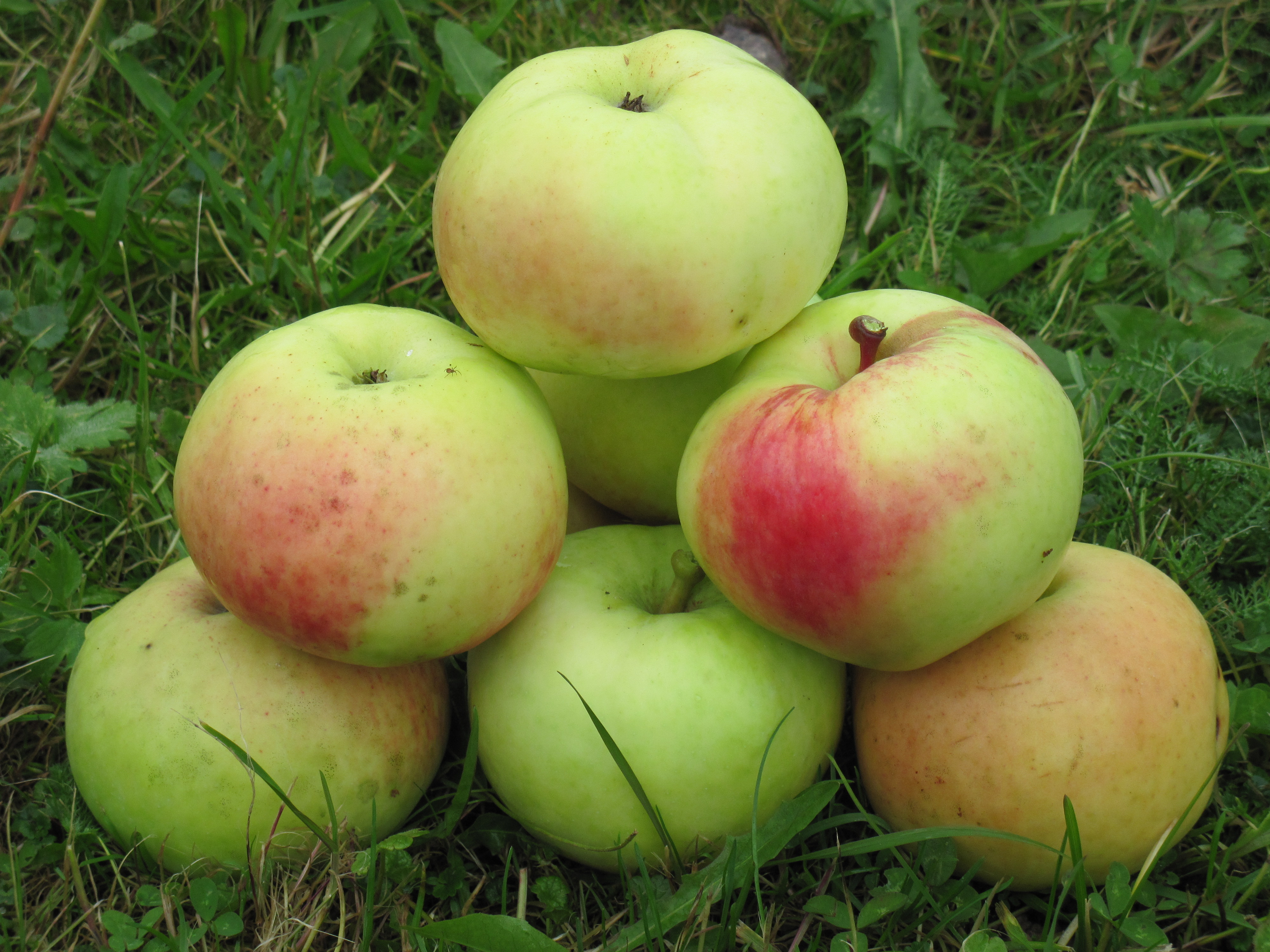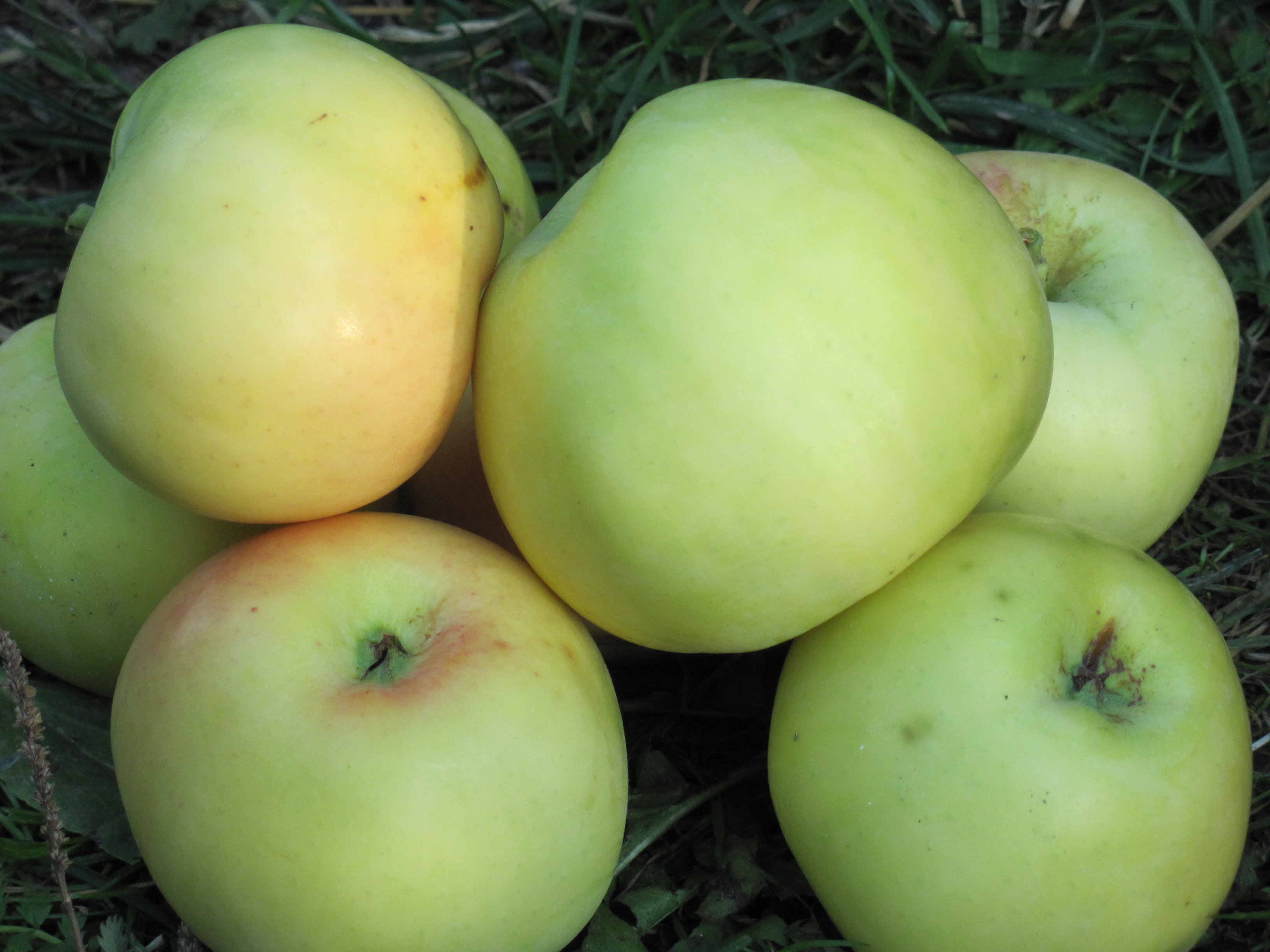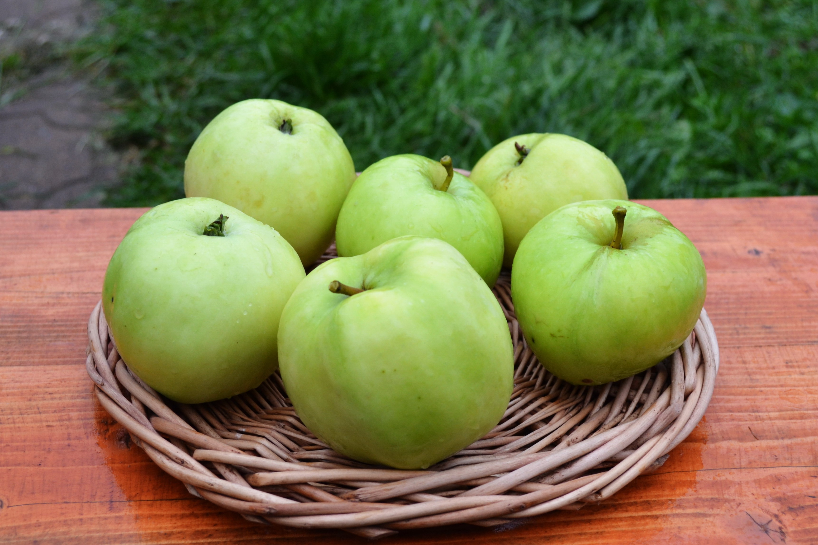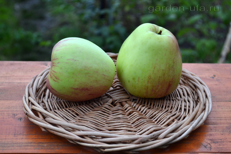 Плоды среднего размера и выше (135 – 160 г), плоско-округлые, зеленые. Мякоть зеленоватая, средней плотности, нежная, сочная, гармоничного кисло-сладкого вкуса с тонким ароматом. В моих условиях созревают в начале августа, одновременно с сортом Елена.